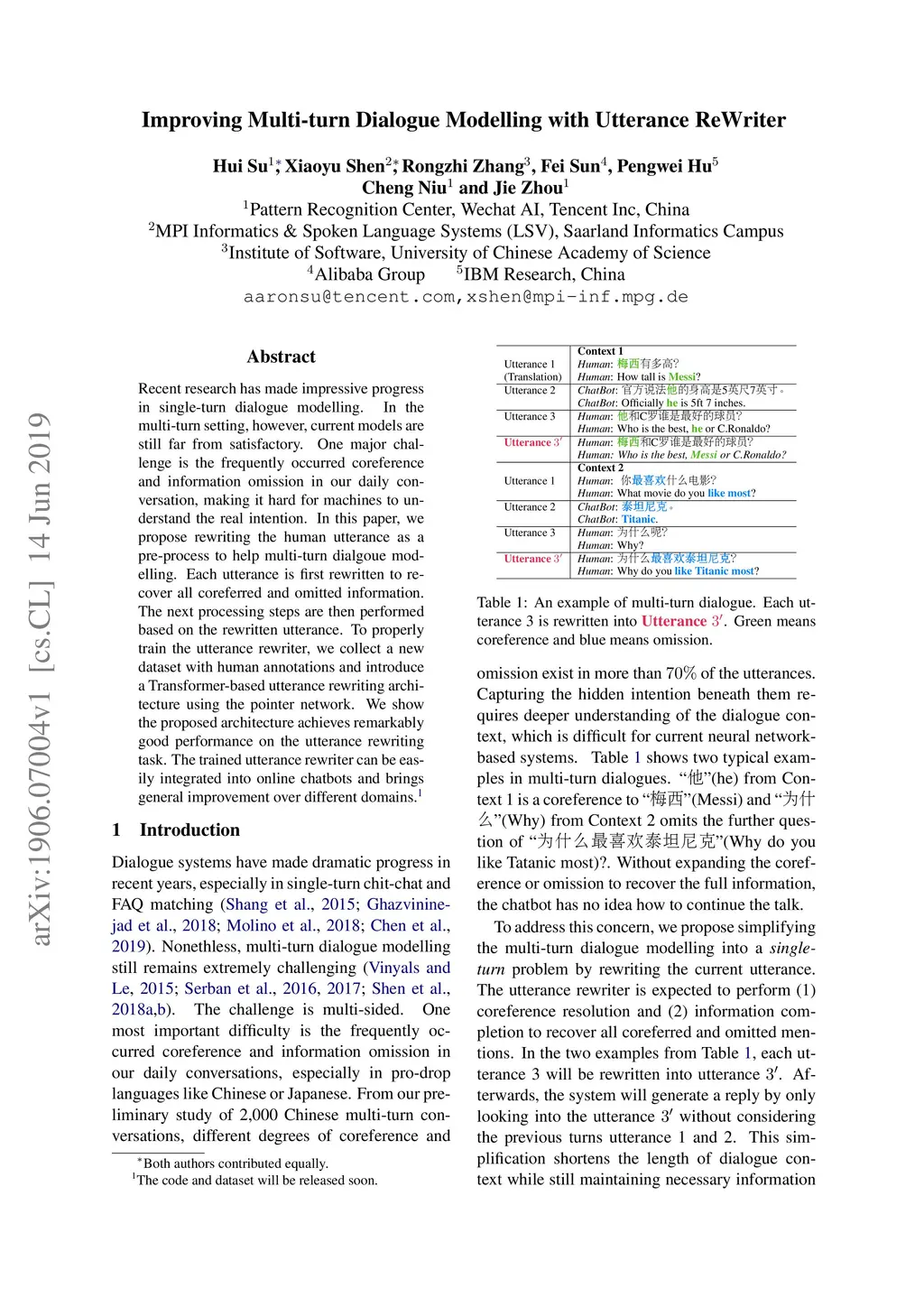 Recent research has made impressive progress in single-turn dialogue modelling. In the multi-turn setting, however, current models are still far from satisfactory. One major challenge is the frequently occurred coreference and information omission in our daily conversation, making it hard for machines to understand the real intention. In this paper, we propose rewriting the human utterance as a pre-process to help multi-turn dialgoue modelling. Each utterance is first rewritten to recover all coreferred and omitted information. The next processing steps are then performed based on the rewritten utterance. To properly train the utterance rewriter, we collect a new dataset with human annotations and introduce a Transformer-based utterance rewriting architecture using the pointer network. We show the proposed architecture achieves remarkably good performance on the utterance rewriting task. The trained utterance rewriter can be easily integrated into online chatbots and brings general improvement over different domains.