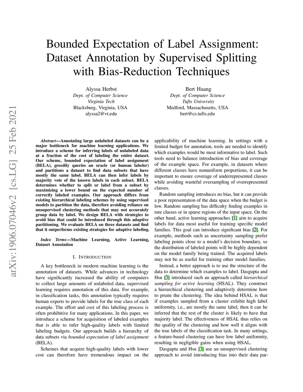 Annotating large unlabeled datasets can be a major bottleneck for machine learning applications. We introduce a scheme for inferring labels of unlabeled data at a fraction of the cost of labeling the entire dataset. Our scheme, bounded expectation of label assignment (BELA), greedily queries an oracle (or human labeler) and partitions a dataset to find data subsets that have mostly the same label. BELA can then infer labels by majority vote of the known labels in each subset. BELA determines whether to split or label from a subset by maximizing a lower bound on the expected number of correctly labeled examples. Our approach differs from existing hierarchical labeling schemes by using supervised models to partition the data, therefore avoiding reliance on unsupervised clustering methods that may not accurately group data by label. We design BELA with strategies to avoid bias that could be introduced through this adaptive partitioning. We evaluate BELA on three datasets and find that it outperforms existing strategies for adaptive labeling.