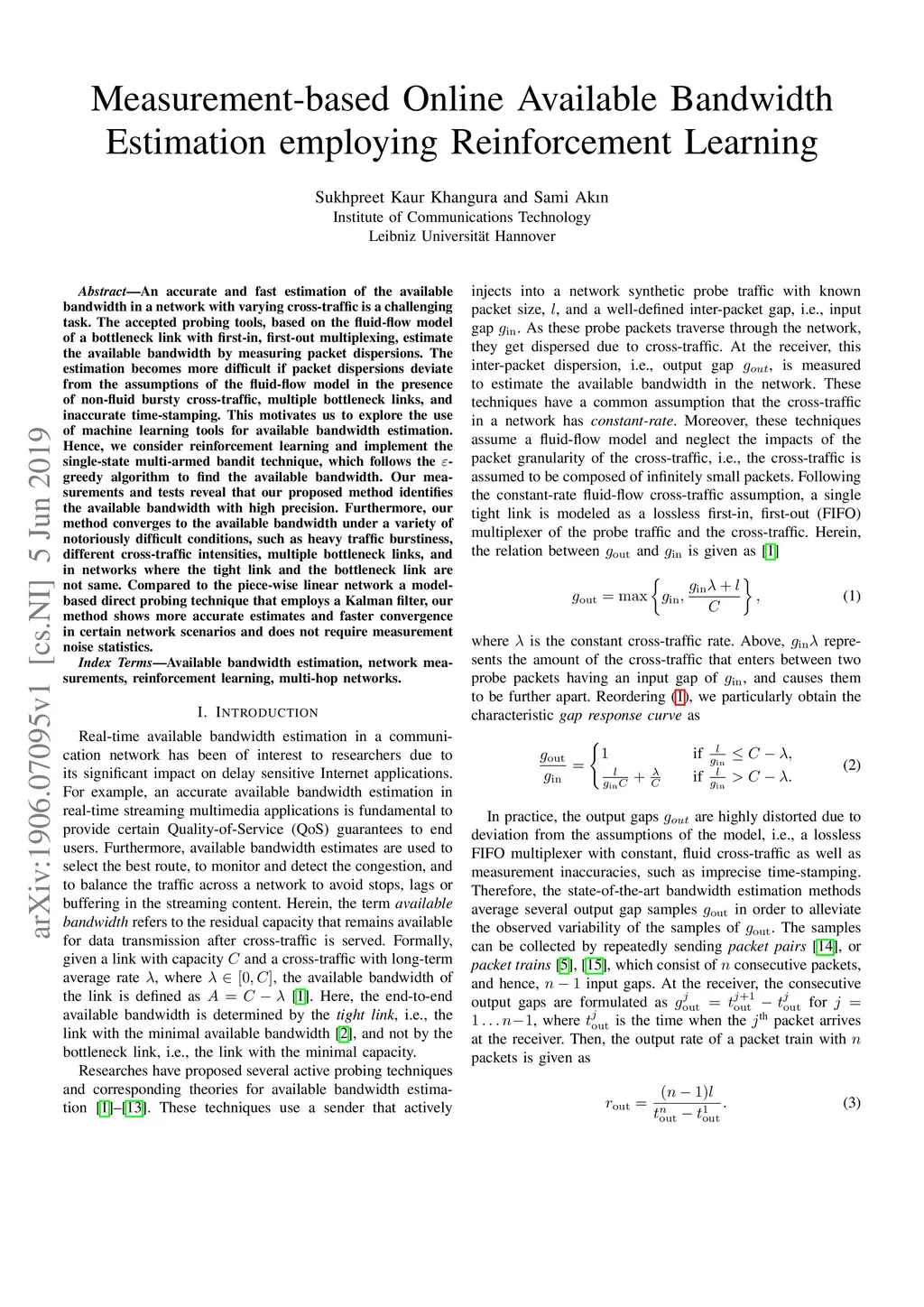 An accurate and fast estimation of the available bandwidth in a network with varying cross-traffic is a challenging task. The accepted probing tools, based on the fluid-flow model of a bottleneck link with first-in, first-out multiplexing, estimate the available bandwidth by measuring packet dispersions. The estimation becomes more difficult if packet dispersions deviate from the assumptions of the fluid-flow model in the presence of non-fluid bursty cross-traffic, multiple bottleneck links, and inaccurate time-stamping. This motivates us to explore the use of machine learning tools for available bandwidth estimation. Hence, we consider reinforcement learning and implement the single-state multi-armed bandit technique, which follows the -greedy algorithm to find the available bandwidth. Our measurements and tests reveal that our proposed method identifies the available bandwidth with high precision. Furthermore, our method converges to the available bandwidth under a variety of notoriously difficult conditions, such as heavy traffic burstiness, different cross-traffic intensities, multiple bottleneck links, and in networks where the tight link and the bottleneck link are not same. Compared to the piece-wise linear network a model-based direct probing technique that employs a Kalman filter, our method shows more accurate estimates and faster convergence in certain network scenarios and does not require measurement noise statistics.
