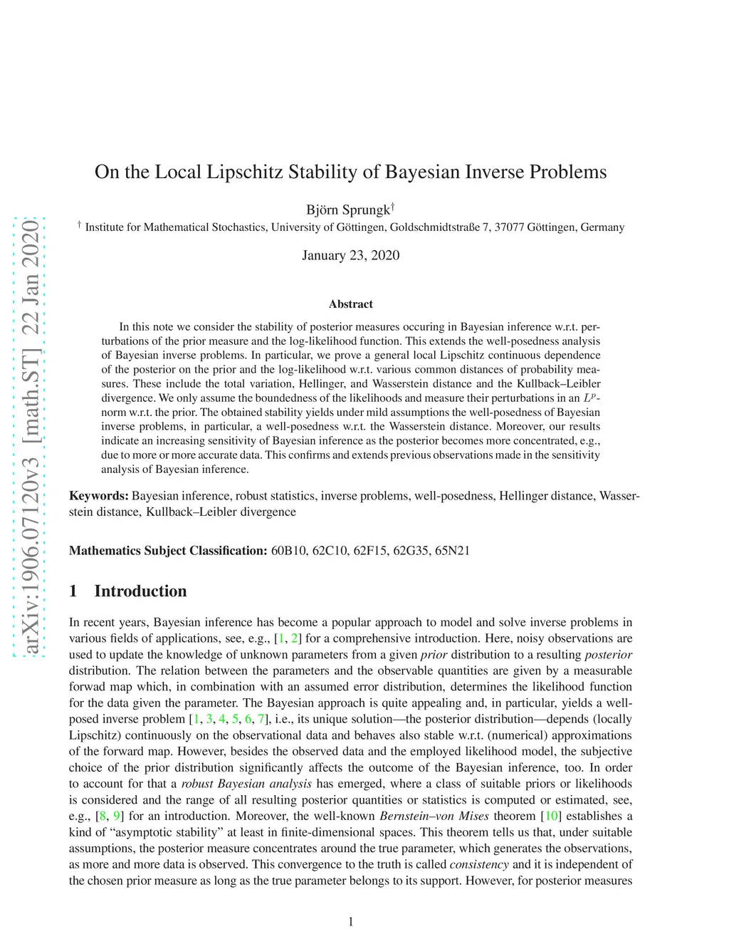 In this note we consider the stability of posterior measures occuring in Bayesian inference w.r.t. perturbations of the prior measure and the log-likelihood function. This extends the well-posedness analysis of Bayesian inverse problems. In particular, we prove a general local Lipschitz continuous dependence of the posterior on the prior and the log-likelihood w.r.t. various common distances of probability measures. These include the total variation, Hellinger, and Wasserstein distance and the Kullback-Leibler divergence. We only assume the boundedness of the likelihoods and measure their perturbations in an -norm w.r.t. the prior. The obtained stability yields under mild assumptions the well-posedness of Bayesian inverse problems, in particular, a well-posedness w.r.t. the Wasserstein distance. Moreover, our results indicate an increasing sensitivity of Bayesian inference as the posterior becomes more concentrated, e.g., due to more or more accurate data. This confirms and extends previous observations made in the sensitivity analysis of Bayesian inference.