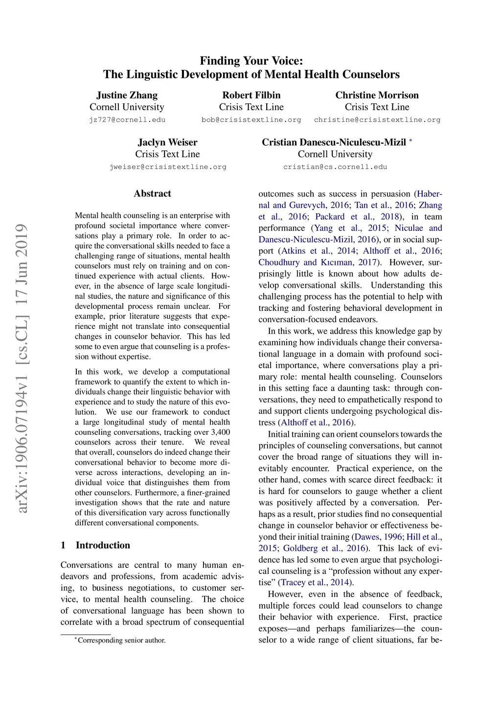 Mental health counseling is an enterprise with profound societal importance where conversations play a primary role. In order to acquire the conversational skills needed to face a challenging range of situations, mental health counselors must rely on training and on continued experience with actual clients. However, in the absence of large scale longitudinal studies, the nature and significance of this developmental process remain unclear. For example, prior literature suggests that experience might not translate into consequential changes in counselor behavior. This has led some to even argue that counseling is a profession without expertise. In this work, we develop a computational framework to quantify the extent to which individuals change their linguistic behavior with experience and to study the nature of this evolution. We use our framework to conduct a large longitudinal study of mental health counseling conversations, tracking over 3,400 counselors across their tenure. We reveal that overall, counselors do indeed change their conversational behavior to become more diverse across interactions, developing an individual voice that distinguishes them from other counselors. Furthermore, a finer-grained investigation shows that the rate and nature of this diversification vary across functionally different conversational components.