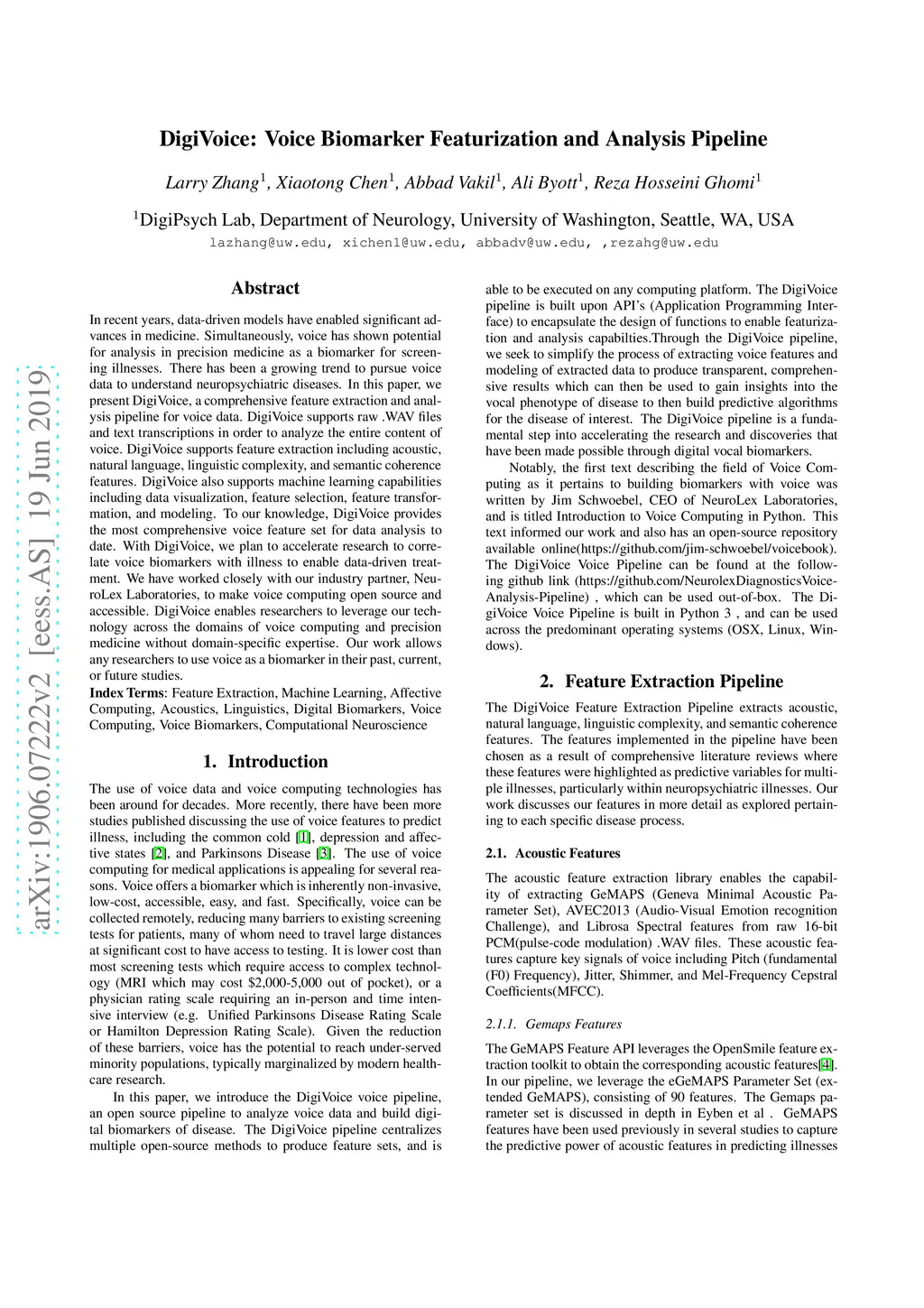 In recent years, data-driven models have enabled significant advances in medicine. Simultaneously, voice has shown potential for analysis in precision medicine as a biomarker for screening illnesses. There has been a growing trend to pursue voice data to understand neuropsychiatric diseases. In this paper, we present DigiVoice, a comprehensive feature extraction and analysis pipeline for voice data. DigiVoice supports raw .WAV files and text transcriptions in order to analyze the entire content of voice. DigiVoice supports feature extraction including acoustic, natural language, linguistic complexity, and semantic coherence features. DigiVoice also supports machine learning capabilities including data visualization, feature selection, feature transformation, and modeling. To our knowledge, DigiVoice provides the most comprehensive voice feature set for data analysis to date. With DigiVoice, we plan to accelerate research to correlate voice biomarkers with illness to enable data-driven treatment. We have worked closely with our industry partner, NeuroLex Laboratories, to make voice computing open source and accessible. DigiVoice enables researchers to leverage our technology across the domains of voice computing and precision medicine without domain-specific expertise. Our work allows any researchers to use voice as a biomarker in their past, current, or future studies.