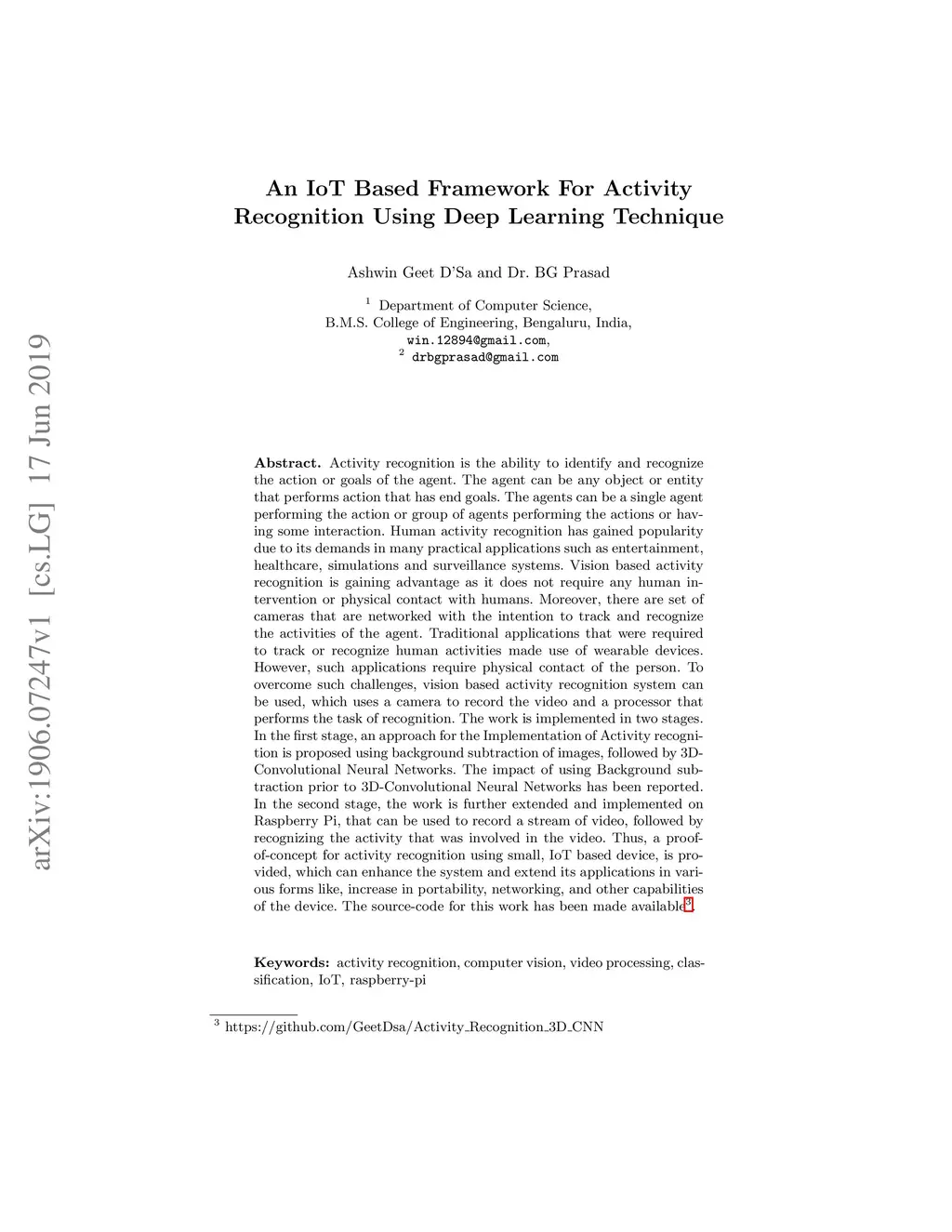 Activity recognition is the ability to identify and recognize the action or goals of the agent. The agent can be any object or entity that performs action that has end goals. The agents can be a single agent performing the action or group of agents performing the actions or having some interaction. Human activity recognition has gained popularity due to its demands in many practical applications such as entertainment, healthcare, simulations and surveillance systems. Vision based activity recognition is gaining advantage as it does not require any human intervention or physical contact with humans. Moreover, there are set of cameras that are networked with the intention to track and recognize the activities of the agent. Traditional applications that were required to track or recognize human activities made use of wearable devices. However, such applications require physical contact of the person. To overcome such challenges, vision based activity recognition system can be used, which uses a camera to record the video and a processor that performs the task of recognition. The work is implemented in two stages. In the first stage, an approach for the Implementation of Activity recognition is proposed using background subtraction of images, followed by 3D- Convolutional Neural Networks. The impact of using Background subtraction prior to 3D-Convolutional Neural Networks has been reported. In the second stage, the work is further extended and implemented on Raspberry Pi, that can be used to record a stream of video, followed by recognizing the activity that was involved in the video. Thus, a proof-of-concept for activity recognition using small, IoT based device, is provided, which can enhance the system and extend its applications in various forms like, increase in portability, networking, and other capabilities of the device.