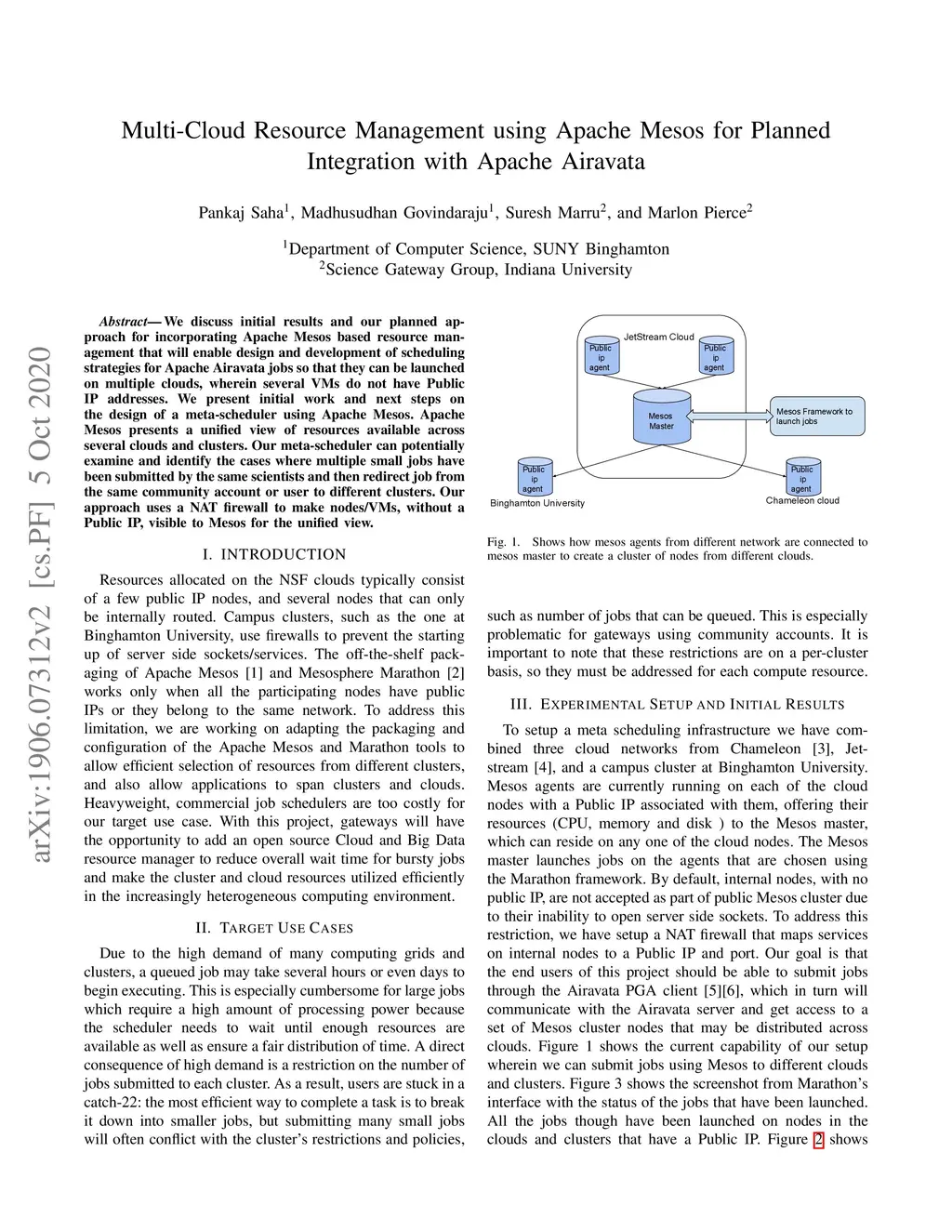 We discuss initial results and our planned approach for incorporating Apache Mesos based resource management that will enable design and development of scheduling strategies for Apache Airavata jobs so that they can be launched on multiple clouds, wherein several VMs do not have Public IP addresses. We present initial work and next steps on the design of a meta-scheduler using Apache Mesos. Apache Mesos presents a unified view of resources available across several clouds and clusters. Our meta-scheduler can potentially examine and identify the cases where multiple small jobs have been submitted by the same scientists and then redirect job from the same community account or user to different clusters. Our approach uses a NAT firewall to make nodes/VMs, without a Public IP, visible to Mesos for the unified view.