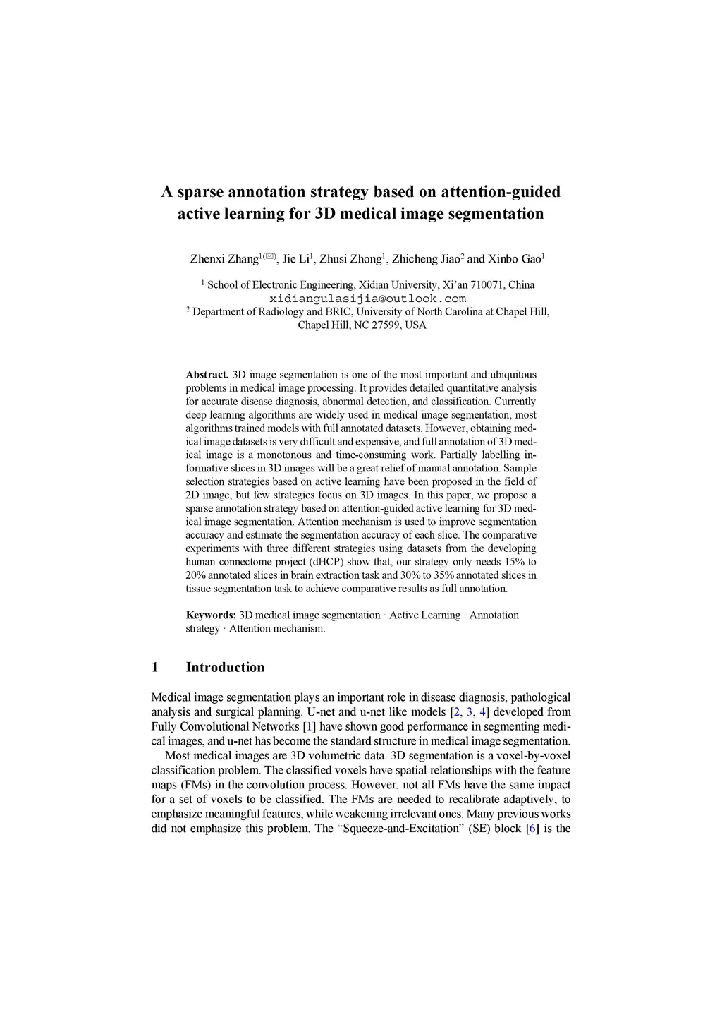 3D image segmentation is one of the most important and ubiquitous problems in medical image processing. It provides detailed quantitative analysis for accurate disease diagnosis, abnormal detection, and classification. Currently deep learning algorithms are widely used in medical image segmentation, most algorithms trained models with full annotated datasets. However, obtaining medical image datasets is very difficult and expensive, and full annotation of 3D medical image is a monotonous and time-consuming work. Partially labelling informative slices in 3D images will be a great relief of manual annotation. Sample selection strategies based on active learning have been proposed in the field of 2D image, but few strategies focus on 3D images. In this paper, we propose a sparse annotation strategy based on attention-guided active learning for 3D medical image segmentation. Attention mechanism is used to improve segmentation accuracy and estimate the segmentation accuracy of each slice. The comparative experiments with three different strategies using datasets from the developing human connectome project (dHCP) show that, our strategy only needs 15% to 20% annotated slices in brain extraction task and 30% to 35% annotated slices in tissue segmentation task to achieve comparative results as full annotation.