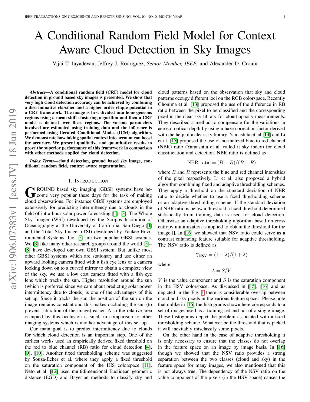 A Conditional Random Field Model for Context Aware Cloud Detection in