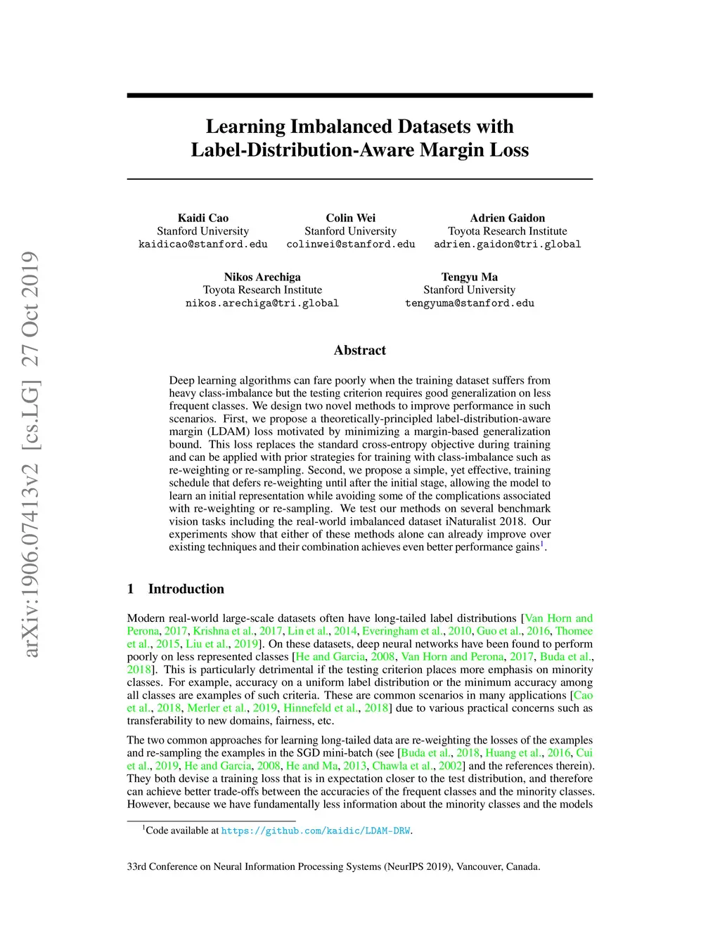 Deep learning algorithms can fare poorly when the training dataset suffers from heavy class-imbalance but the testing criterion requires good generalization on less frequent classes. We design two novel methods to improve performance in such scenarios. First, we propose a theoretically-principled label-distribution-aware margin (LDAM) loss motivated by minimizing a margin-based generalization bound. This loss replaces the standard cross-entropy objective during training and can be applied with prior strategies for training with class-imbalance such as re-weighting or re-sampling. Second, we propose a simple, yet effective, training schedule that defers re-weighting until after the initial stage, allowing the model to learn an initial representation while avoiding some of the complications associated with re-weighting or re-sampling. We test our methods on several benchmark vision tasks including the real-world imbalanced dataset iNaturalist 2018. Our experiments show that either of these methods alone can already improve over existing techniques and their combination achieves even better performance gains.