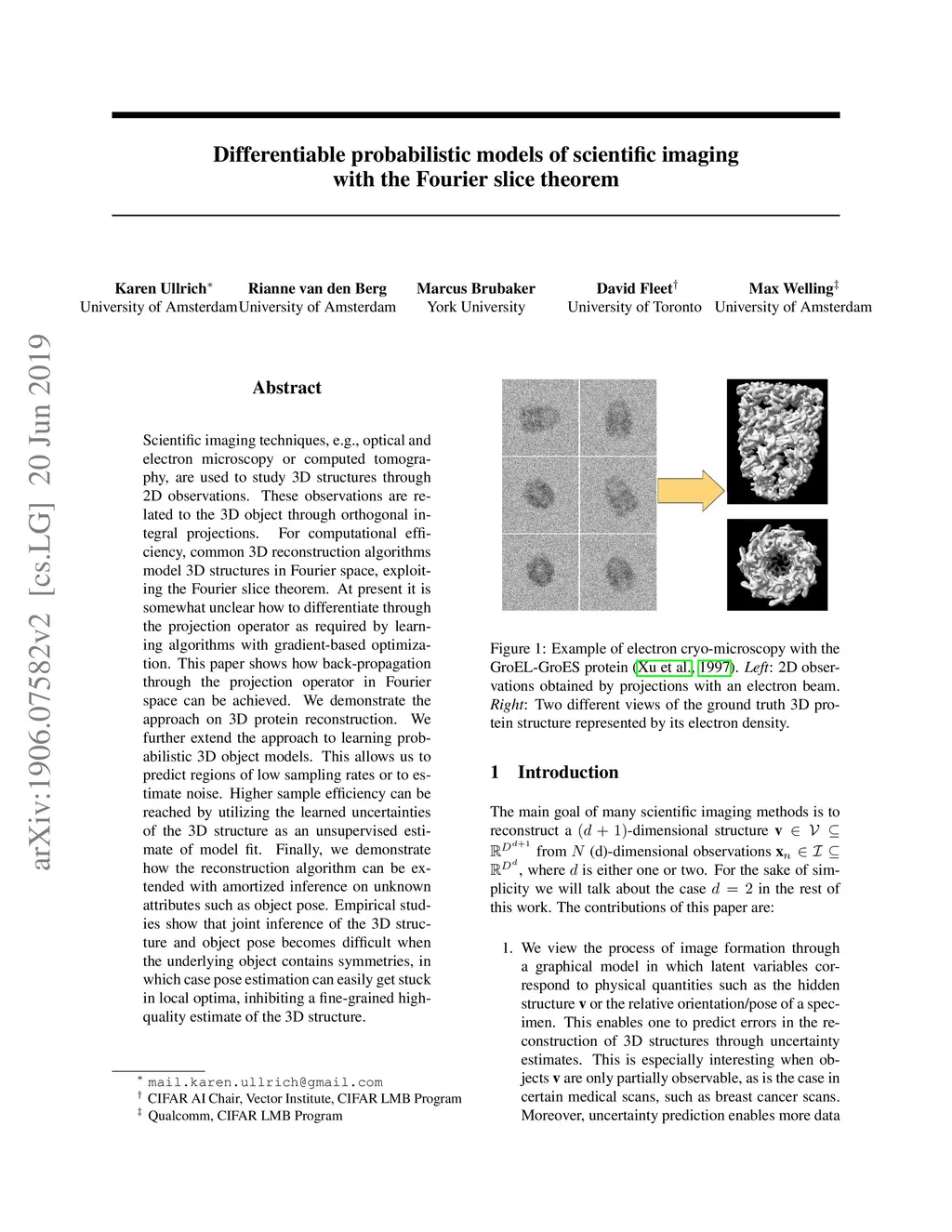 Scientific imaging techniques such as optical and electron microscopy and computed tomography (CT) scanning are used to study the 3D structure of an object through 2D observations. These observations are related to the original 3D object through orthogonal integral projections. For common 3D reconstruction algorithms, computational efficiency requires the modeling of the 3D structures to take place in Fourier space by applying the Fourier slice theorem. At present, it is unclear how to differentiate through the projection operator, and hence current learning algorithms can not rely on gradient based methods to optimize 3D structure models. In this paper we show how back-propagation through the projection operator in Fourier space can be achieved. We demonstrate the validity of the approach with experiments on 3D reconstruction of proteins. We further extend our approach to learning probabilistic models of 3D objects. This allows us to predict regions of low sampling rates or estimate noise. A higher sample efficiency can be reached by utilizing the learned uncertainties of the 3D structure as an unsupervised estimate of the model fit. Finally, we demonstrate how the reconstruction algorithm can be extended with an amortized inference scheme on unknown attributes such as object pose. Through empirical studies we show that joint inference of the 3D structure and the object pose becomes more difficult when the ground truth object contains more symmetries. Due to the presence of for instance (approximate) rotational symmetries, the pose estimation can easily get stuck in local optima, inhibiting a fine-grained high-quality estimate of the 3D structure.