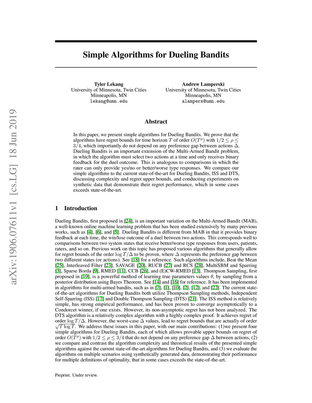 Simple Algorithms for Dueling Bandits
