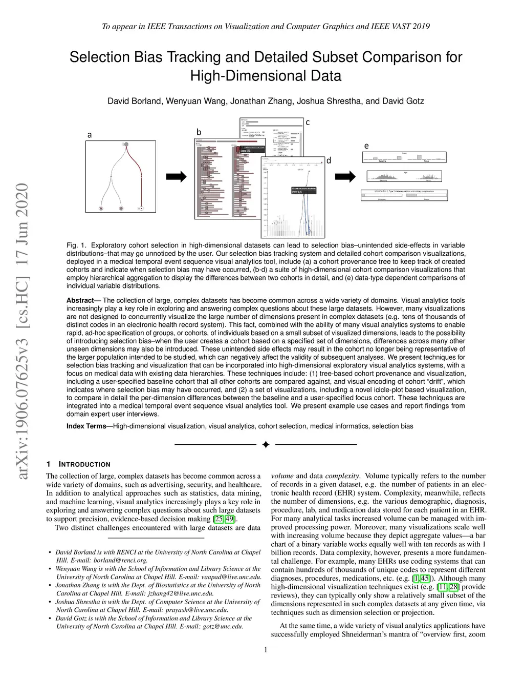 The collection of large, complex datasets has become common across a wide variety of domains. Visual analytics tools increasingly play a key role in exploring and answering complex questions about these large datasets. However, many visualizations are not designed to concurrently visualize the large number of dimensions present in complex datasets (e.g. tens of thousands of distinct codes in an electronic health record system). This fact, combined with the ability of many visual analytics systems to enable rapid, ad-hoc specification of groups, or cohorts, of individuals based on a small subset of visualized dimensions, leads to the possibility of introducing selection bias--when the user creates a cohort based on a specified set of dimensions, differences across many other unseen dimensions may also be introduced. These unintended side effects may result in the cohort no longer being representative of the larger population intended to be studied, which can negatively affect the validity of subsequent analyses. We present techniques for selection bias tracking and visualization that can be incorporated into high-dimensional exploratory visual analytics systems, with a focus on medical data with existing data hierarchies. These techniques include: (1) tree-based cohort provenance and visualization, with a user-specified baseline cohort that all other cohorts are compared against, and visual encoding of the drift for each cohort, which indicates where selection bias may have occurred, and (2) a set of visualizations, including a novel icicle-plot based visualization, to compare in detail the per-dimension differences between the baseline and a user-specified focus cohort. These techniques are integrated into a medical temporal event sequence visual analytics tool. We present example use cases and report findings from domain expert user interviews.