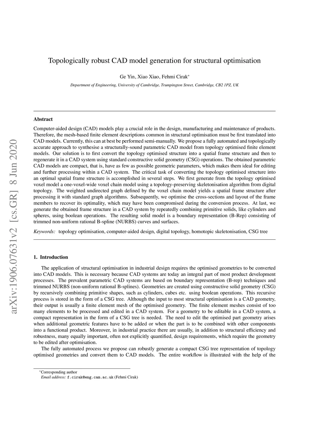 Computer-aided design (CAD) models play a crucial role in the design, manufacturing and maintenance of products. Therefore, the mesh-based finite element descriptions common in structural optimisation must be first translated into CAD models. Currently, this can at best be performed semi-manually. We propose a fully automated and topologically accurate approach to synthesise a structurally-sound parametric CAD model from topology optimised finite element models. Our solution is to first convert the topology optimised structure into a spatial frame structure and then to regenerate it in a CAD system using standard constructive solid geometry (CSG) operations. The obtained parametric CAD models are compact, that is, have as few as possible geometric parameters, which makes them ideal for editing and further processing within a CAD system. The critical task of converting the topology optimised structure into an optimal spatial frame structure is accomplished in several steps. We first generate from the topology optimised voxel model a one-voxel-wide voxel chain model using a topology-preserving skeletonisation algorithm from digital topology. The weighted undirected graph defined by the voxel chain model yields a spatial frame structure after processing it with standard graph algorithms. Subsequently, we optimise the cross-sections and layout of the frame members to recover its optimality, which may have been compromised during the conversion process. At last, we generate the obtained frame structure in a CAD system by repeatedly combining primitive solids, like cylinders and spheres, using boolean operations. The resulting solid model is a boundary representation (B-Rep) consisting of trimmed non-uniform rational B-spline (NURBS) curves and surfaces.