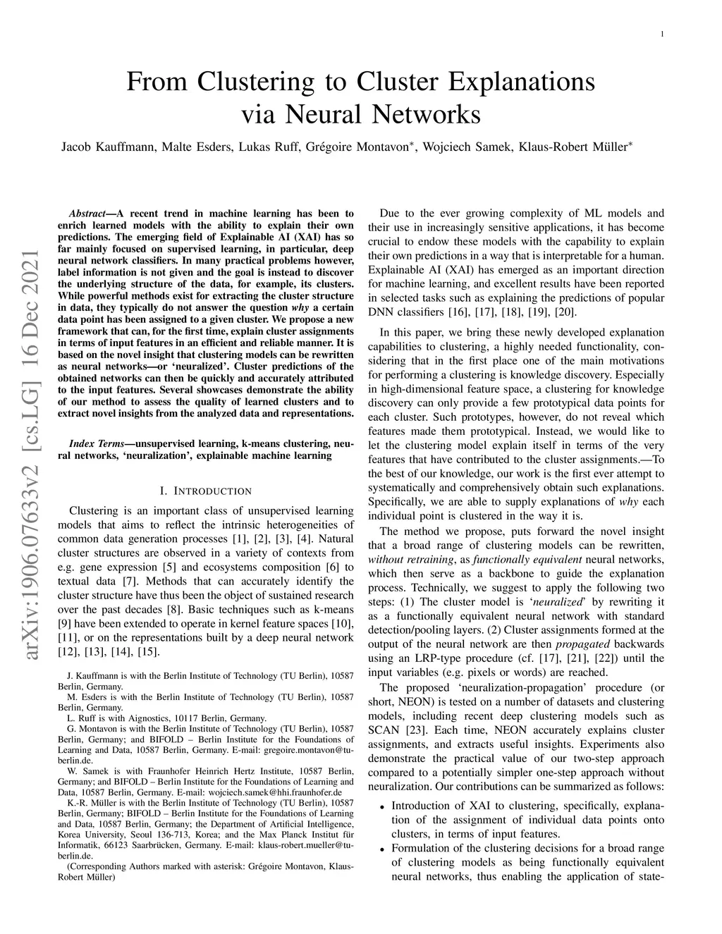A recent trend in machine learning has been to enrich learned models with the ability to explain their own predictions. The emerging field of Explainable AI (XAI) has so far mainly focused on supervised learning, in particular, deep neural network classifiers. In many practical problems however, label information is not given and the goal is instead to discover the underlying structure of the data, for example, its clusters. While powerful methods exist for extracting the cluster structure in data, they typically do not answer the question why a certain data point has been assigned to a given cluster. We propose a new framework that can, for the first time, explain cluster assignments in terms of input features in an efficient and reliable manner. It is based on the novel insight that clustering models can be rewritten as neural networks - or ñeuralized'. Cluster predictions of the obtained networks can then be quickly and accurately attributed to the input features. Several showcases demonstrate the ability of our method to assess the quality of learned clusters and to extract novel insights from the analyzed data and representations.