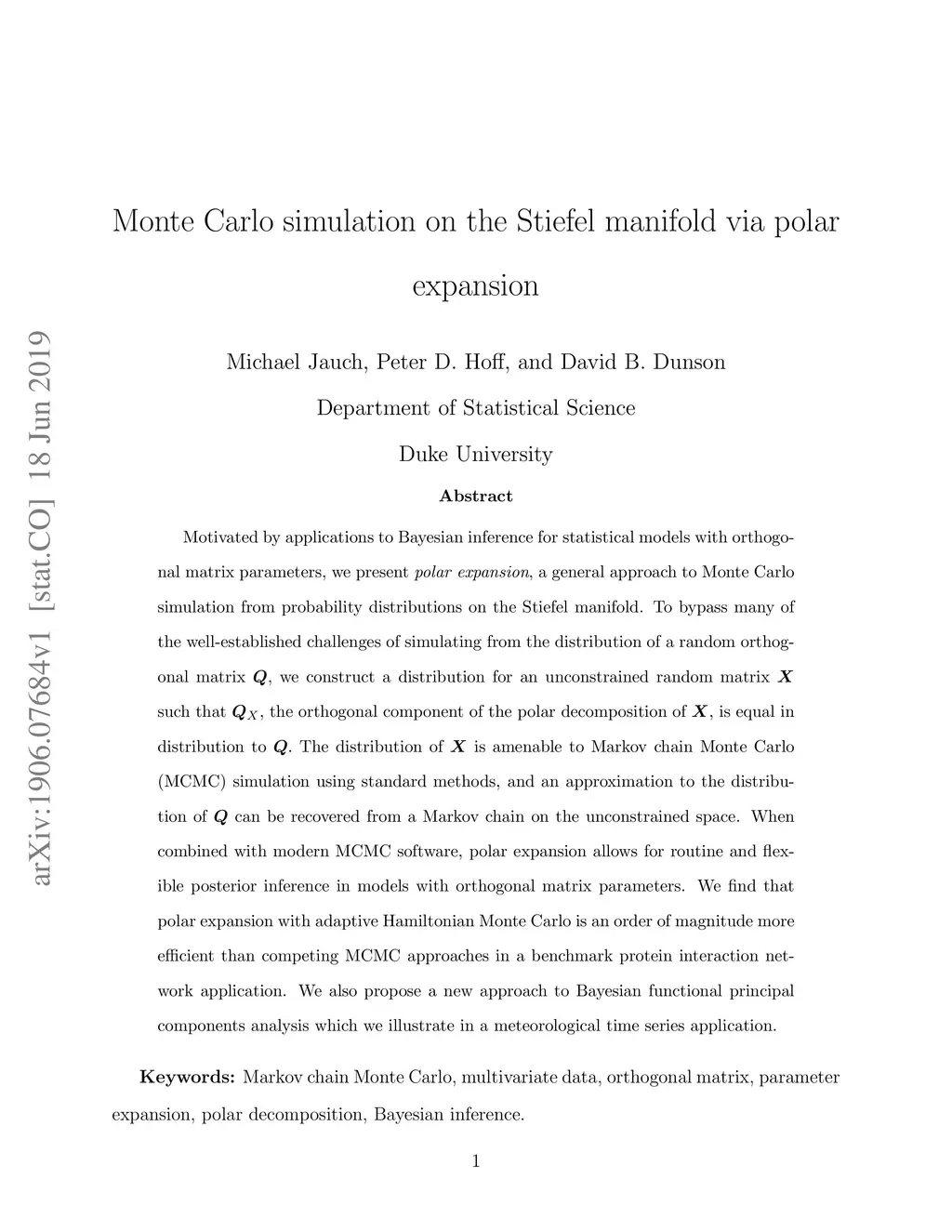 Motivated by applications to Bayesian inference for statistical models with orthogonal matrix parameters, we present a general approach to Monte Carlo simulation from probability distributions on the Stiefel manifold. To bypass many of the well-established challenges of simulating from the distribution of a random orthogonal matrix we construct a distribution for an unconstrained random matrix such that the orthogonal component of the polar decomposition of is equal in distribution to The distribution of is amenable to Markov chain Monte Carlo (MCMC) simulation using standard methods, and an approximation to the distribution of can be recovered from a Markov chain on the unconstrained space. When combined with modern MCMC software, polar expansion allows for routine and flexible posterior inference in models with orthogonal matrix parameters. We find that polar expansion with adaptive Hamiltonian Monte Carlo is an order of magnitude more efficient than competing MCMC approaches in a benchmark protein interaction network application. We also propose a new approach to Bayesian functional principal components analysis which we illustrate in a meteorological time series application.