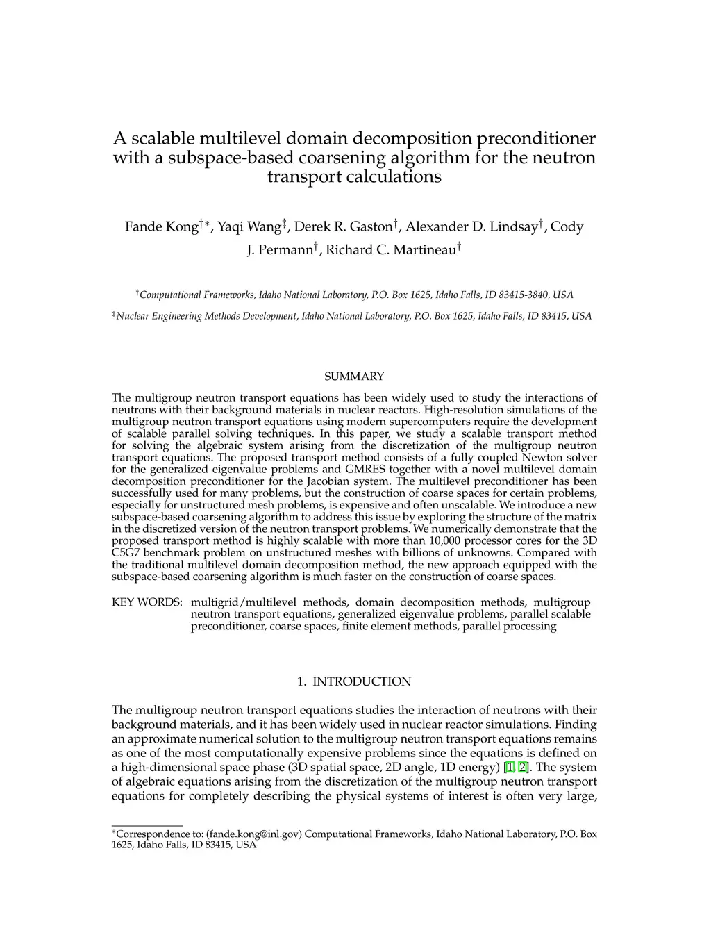 The multigroup neutron transport equations has been widely used to study the interactions of neutrons with their background materials in nuclear reactors. High-resolution simulations of the multigroup neutron transport equations using modern supercomputers require the development of scalable parallel solving techniques. In this paper, we study a scalable transport method for solving the algebraic system arising from the discretization of the multigroup neutron transport equations. The proposed transport method consists of a fully coupled Newton solver for the generalized eigenvalue problems and GMRES together with a novel multilevel domain decomposition preconditioner for the Jacobian system. The multilevel preconditioner has been successfully used for many problems, but the construction of coarse spaces for certain problems, especially for unstructured mesh problems, is expensive and often unscalable. We introduce a new subspace-based coarsening algorithm to address this issue by exploring the structure of the matrix in the discretized version of the neutron transport problems. We numerically demonstrate that the proposed transport method is highly scalable with more than 10,000 processor cores for the 3D C5G7 benchmark problem on unstructured meshes with billions of unknowns. Compared with the traditional multilevel domain decomposition method, the new approach equipped with the subspace-based coarsening algorithm is much faster on the construction of coarse spaces.