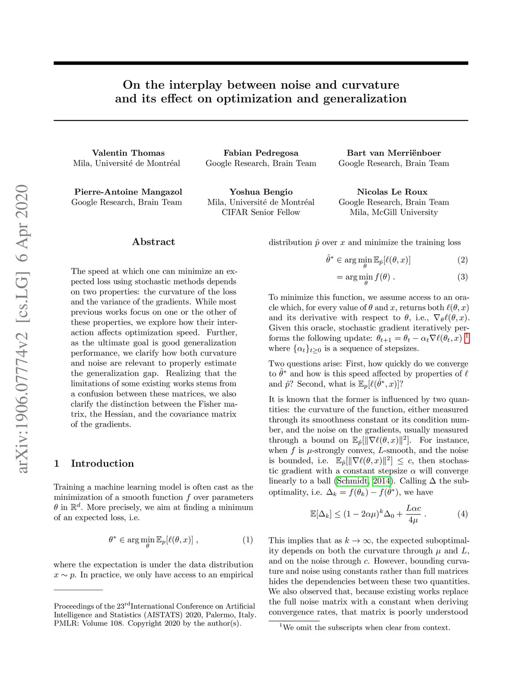 The speed at which one can minimize an expected loss using stochastic methods depends on two properties: the curvature of the loss and the variance of the gradients. While most previous works focus on one or the other of these properties, we explore how their interaction affects optimization speed. Further, as the ultimate goal is good generalization performance, we clarify how both curvature and noise are relevant to properly estimate the generalization gap. Realizing that the limitations of some existing works stems from a confusion between these matrices, we also clarify the distinction between the Fisher matrix, the Hessian, and the covariance matrix of the gradients.