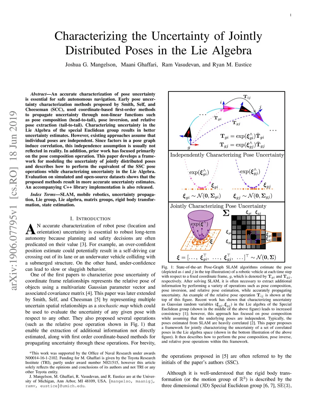 An accurate characterization of pose uncertainty is essential for safe autonomous navigation. Early pose uncertainty characterization methods proposed by Smith, Self, and Cheeseman (SCC), used coordinate-based first-order methods to propagate uncertainty through non-linear functions such as pose composition (head-to-tail), pose inversion, and relative pose extraction (tail-to-tail). Characterizing uncertainty in the Lie Algebra of the special Euclidean group results in better uncertainty estimates. However, existing approaches assume that individual poses are independent. Since factors in a pose graph induce correlation, this independence assumption is usually not reflected in reality. In addition, prior work has focused primarily on the pose composition operation. This paper develops a framework for modeling the uncertainty of jointly distributed poses and describes how to perform the equivalent of the SSC pose operations while characterizing uncertainty in the Lie Algebra. Evaluation on simulated and open-source datasets shows that the proposed methods result in more accurate uncertainty estimates. An accompanying C++ library implementation is also released. This is a pre-print of a paper submitted to IEEE TRO in 2019.