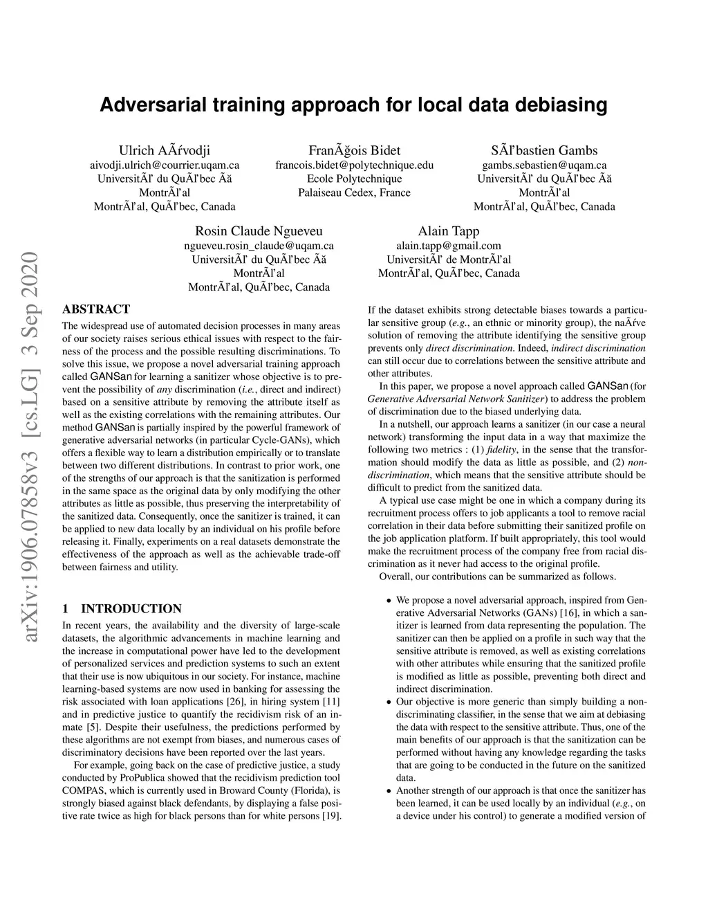 The widespread use of automated decision processes in many areas of our society raises serious ethical issues concerning the fairness of the process and the possible resulting discriminations. In this work, we propose a novel approach called GANsan whose objective is to prevent the possibility of any discrimination i.e., direct and indirect) based on a sensitive attribute by removing the attribute itself as well as the existing correlations with the remaining attributes. Our sanitization algorithm GANsan is partially inspired by the powerful framework of generative adversarial networks (in particular the Cycle-GANs), which offers a flexible way to learn a distribution empirically or to translate between two different distributions. In contrast to prior work, one of the strengths of our approach is that the sanitization is performed in the same space as the original data by only modifying the other attributes as little as possible and thus preserving the interpretability of the sanitized data. As a consequence, once the sanitizer is trained, it can be applied to new data, such as for instance, locally by an individual on his profile before releasing it. Finally, experiments on a real dataset demonstrate the effectiveness of the proposed approach as well as the achievable trade-off between fairness and utility.