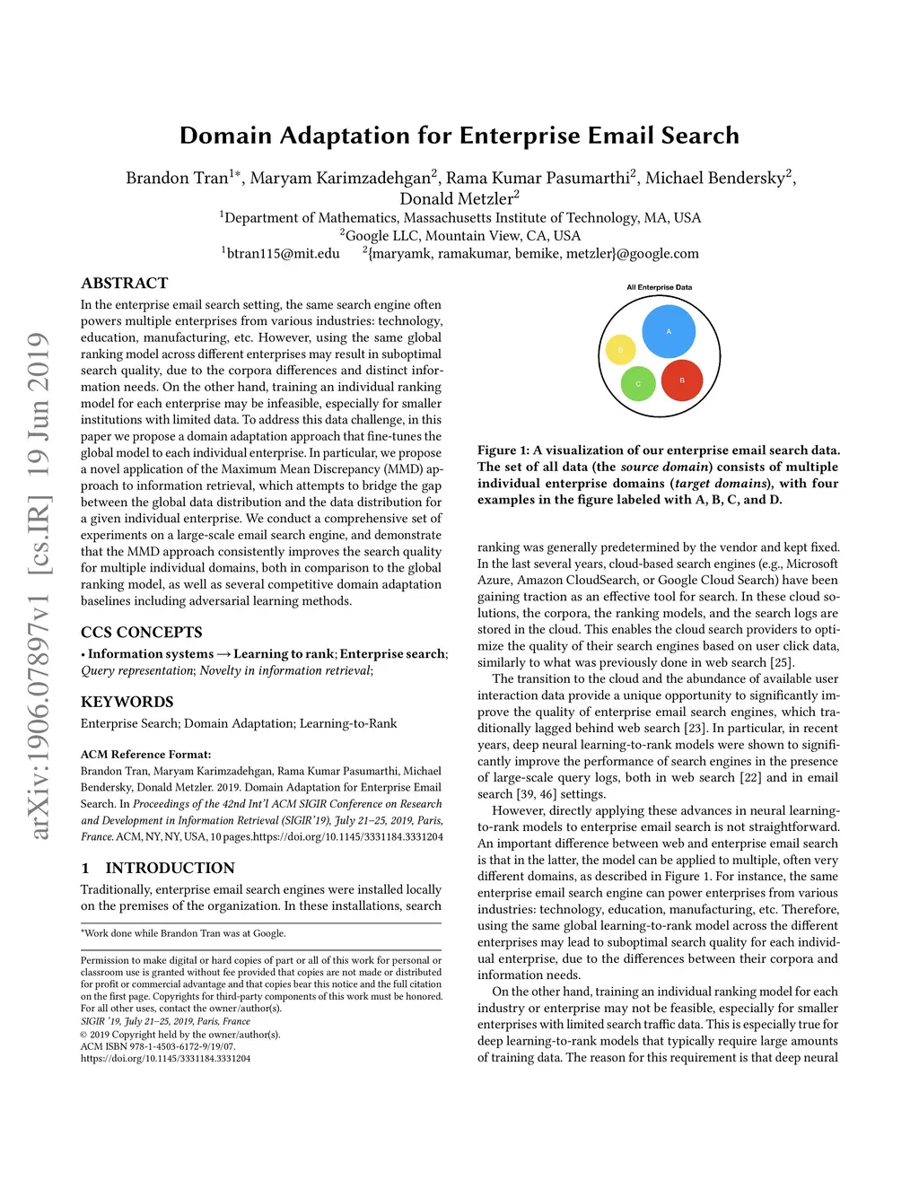 In the enterprise email search setting, the same search engine often powers multiple enterprises from various industries: technology, education, manufacturing, etc. However, using the same global ranking model across different enterprises may result in suboptimal search quality, due to the corpora differences and distinct information needs. On the other hand, training an individual ranking model for each enterprise may be infeasible, especially for smaller institutions with limited data. To address this data challenge, in this paper we propose a domain adaptation approach that fine-tunes the global model to each individual enterprise. In particular, we propose a novel application of the Maximum Mean Discrepancy (MMD) approach to information retrieval, which attempts to bridge the gap between the global data distribution and the data distribution for a given individual enterprise. We conduct a comprehensive set of experiments on a large-scale email search engine, and demonstrate that the MMD approach consistently improves the search quality for multiple individual domains, both in comparison to the global ranking model, as well as several competitive domain adaptation baselines including adversarial learning methods.