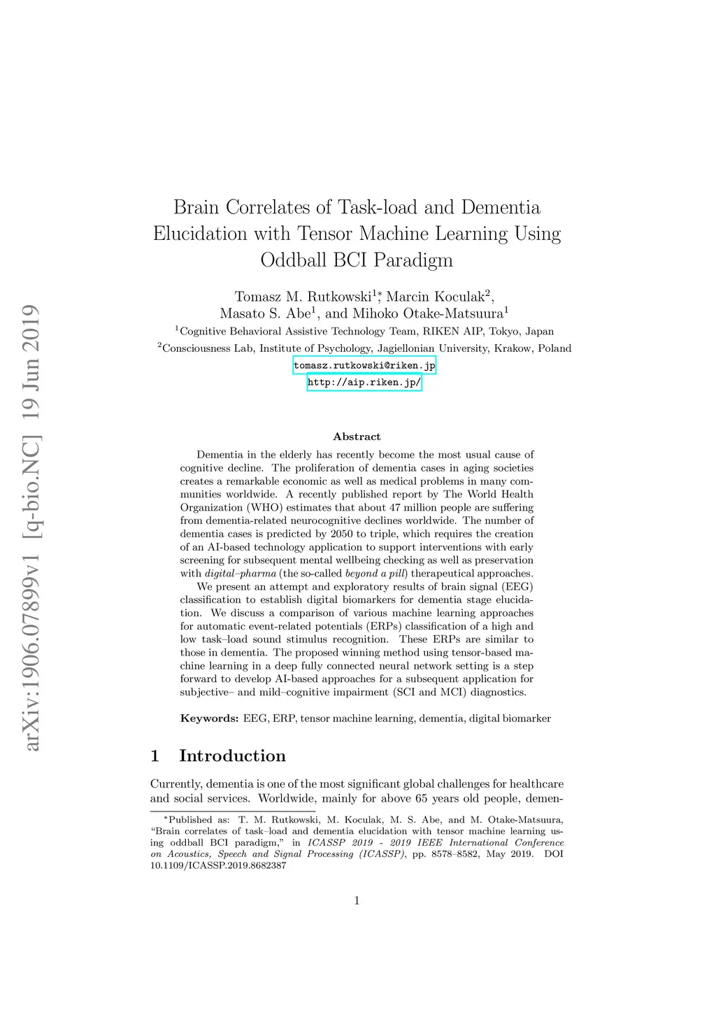 Dementia in the elderly has recently become the most usual cause of cognitive decline. The proliferation of dementia cases in aging societies creates a remarkable economic as well as medical problems in many communities worldwide. A recently published report by The World Health Organization (WHO) estimates that about 47 million people are suffering from dementia-related neurocognitive declines worldwide. The number of dementia cases is predicted by 2050 to triple, which requires the creation of an AI-based technology application to support interventions with early screening for subsequent mental wellbeing checking as well as preservation with digital-pharma (the so-called beyond a pill) therapeutical approaches. We present an attempt and exploratory results of brain signal (EEG) classification to establish digital biomarkers for dementia stage elucidation. We discuss a comparison of various machine learning approaches for automatic event-related potentials (ERPs) classification of a high and low task-load sound stimulus recognition. These ERPs are similar to those in dementia. The proposed winning method using tensor-based machine learning in a deep fully connected neural network setting is a step forward to develop AI-based approaches for a subsequent application for subjective- and mild-cognitive impairment (SCI and MCI) diagnostics.