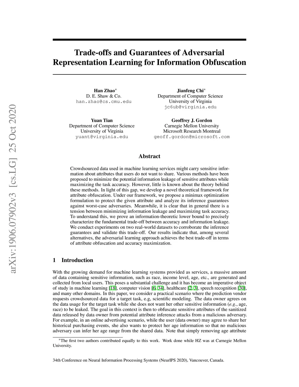 Crowdsourced data used in machine learning services might carry sensitive information about attributes that users do not want to share. Various methods have been proposed to minimize the potential information leakage of sensitive attributes while maximizing the task accuracy. However, little is known about the theory behind these methods. In light of this gap, we develop a novel theoretical framework for attribute obfuscation. Under our framework, we propose a minimax optimization formulation to protect the given attribute and analyze its inference guarantees against worst-case adversaries. Meanwhile, it is clear that in general there is a tension between minimizing information leakage and maximizing task accuracy. To understand this, we prove an information-theoretic lower bound to precisely characterize the fundamental trade-off between accuracy and information leakage. We conduct experiments on two real-world datasets to corroborate the inference guarantees and validate this trade-off. Our results indicate that, among several alternatives, the adversarial learning approach achieves the best trade-off in terms of attribute obfuscation and accuracy maximization.
