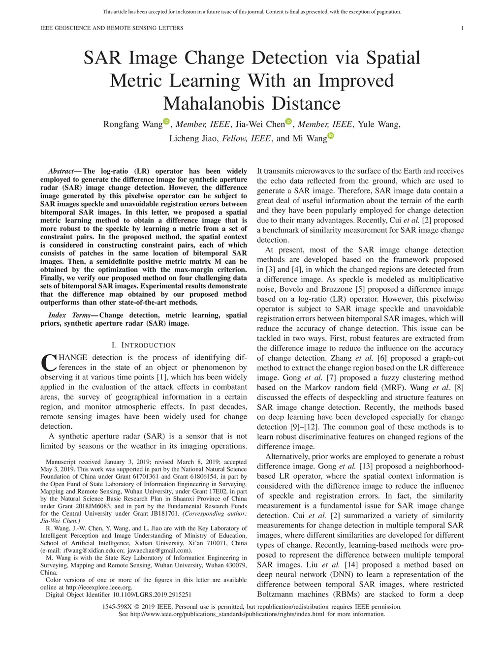 SAR Image Change Detection via Spatial Metric Learning with an Improved