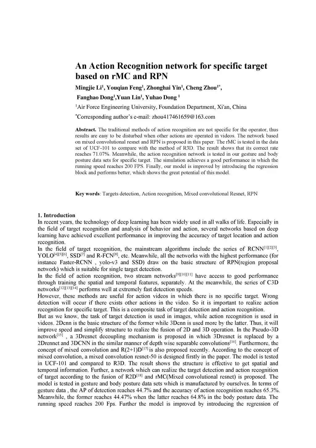 The traditional methods of action recognition are not specific for the operator, thus results are easy to be disturbed when other actions are operated in videos. The network based on mixed convolutional resnet and RPN is proposed in this paper. The rMC is tested in the data set of UCF-101 to compare with the method of R3D. The result shows that its correct rate reaches 71.07%. Meanwhile, the action recognition network is tested in our gesture and body posture data sets for specific target. The simulation achieves a good performance in which the running speed reaches 200 FPS. Finally, our model is improved by introducing the regression block and performs better, which shows the great potential of this model.