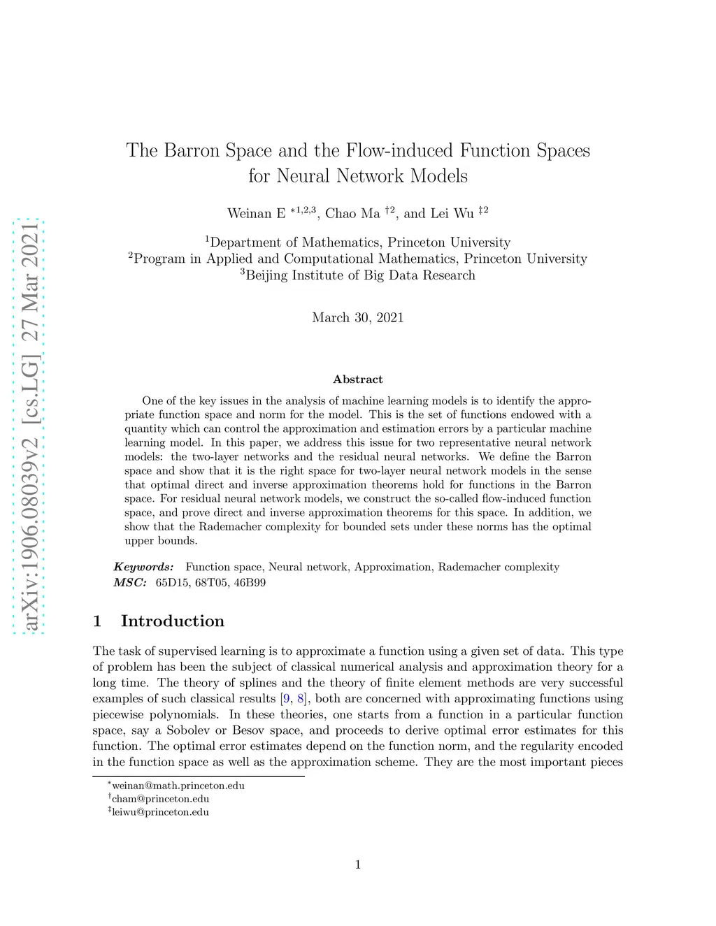 One of the key issues in the analysis of machine learning models is to identify the appropriate function space and norm for the model. This is the set of functions endowed with a quantity which can control the approximation and estimation errors by a particular machine learning model. In this paper, we address this issue for two representative neural network models: the two-layer networks and the residual neural networks. We define the Barron space and show that it is the right space for two-layer neural network models in the sense that optimal direct and inverse approximation theorems hold for functions in the Barron space. For residual neural network models, we construct the so-called flow-induced function space, and prove direct and inverse approximation theorems for this space. In addition, we show that the Rademacher complexity for bounded sets under these norms has the optimal upper bounds.