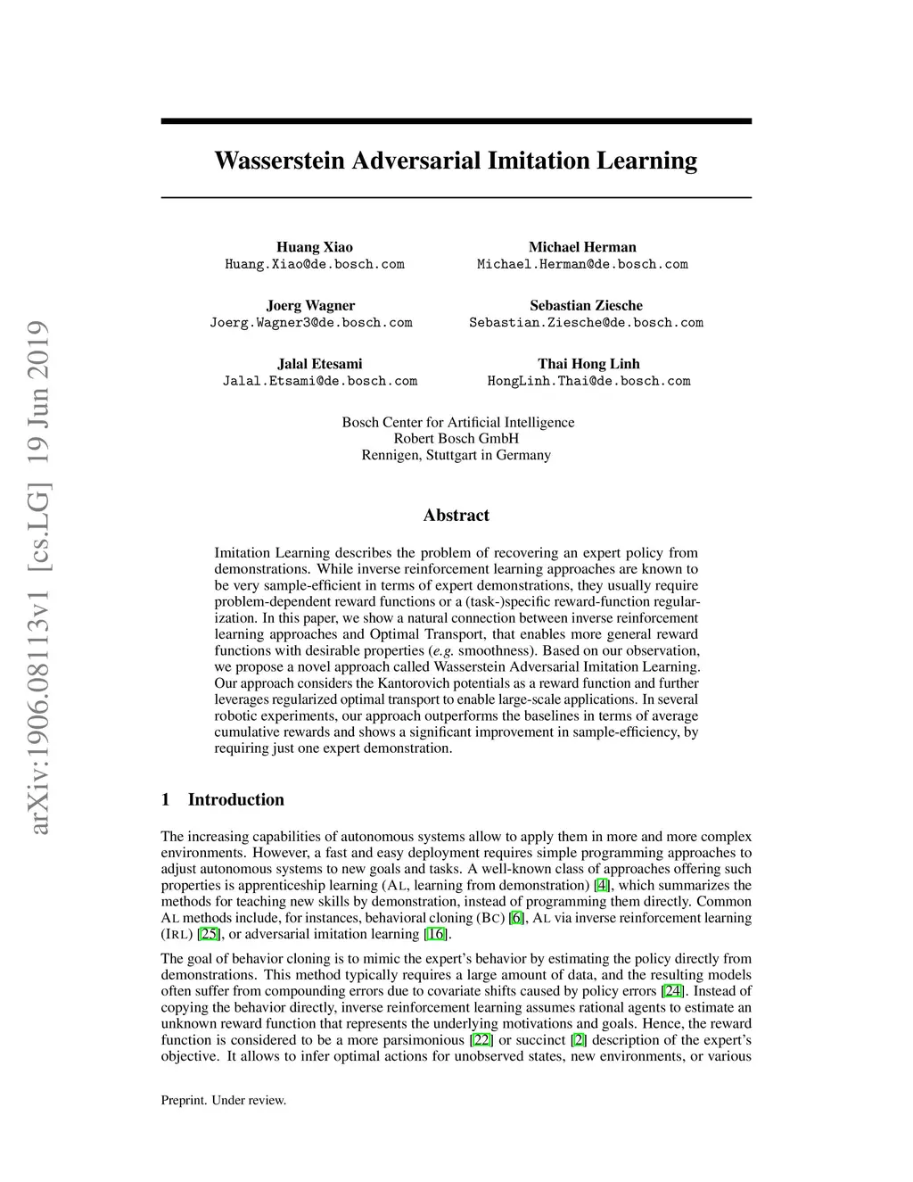 Imitation Learning describes the problem of recovering an expert policy from demonstrations. While inverse reinforcement learning approaches are known to be very sample-efficient in terms of expert demonstrations, they usually require problem-dependent reward functions or a (task-)specific reward-function regularization. In this paper, we show a natural connection between inverse reinforcement learning approaches and Optimal Transport, that enables more general reward functions with desirable properties (e.g., smoothness). Based on our observation, we propose a novel approach called Wasserstein Adversarial Imitation Learning. Our approach considers the Kantorovich potentials as a reward function and further leverages regularized optimal transport to enable large-scale applications. In several robotic experiments, our approach outperforms the baselines in terms of average cumulative rewards and shows a significant improvement in sample-efficiency, by requiring just one expert demonstration.