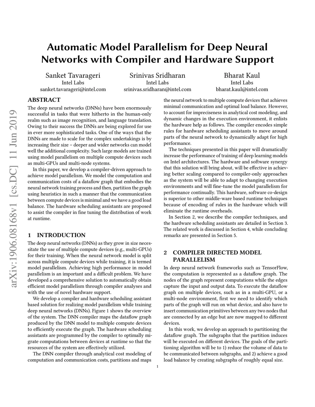 The deep neural networks (DNNs) have been enormously successful in tasks that were hitherto in the human-only realm such as image recognition, and language translation. Owing to their success the DNNs are being explored for use in ever more sophisticated tasks. One of the ways that the DNNs are made to scale for the complex undertakings is by increasing their size -- deeper and wider networks can model well the additional complexity. Such large models are trained using model parallelism on multiple compute devices such as multi-GPUs and multi-node systems. In this paper, we develop a compiler-driven approach to achieve model parallelism. We model the computation and communication costs of a dataflow graph that embodies the neural network training process and then, partition the graph using heuristics in such a manner that the communication between compute devices is minimal and we have a good load balance. The hardware scheduling assistants are proposed to assist the compiler in fine tuning the distribution of work at runtime.