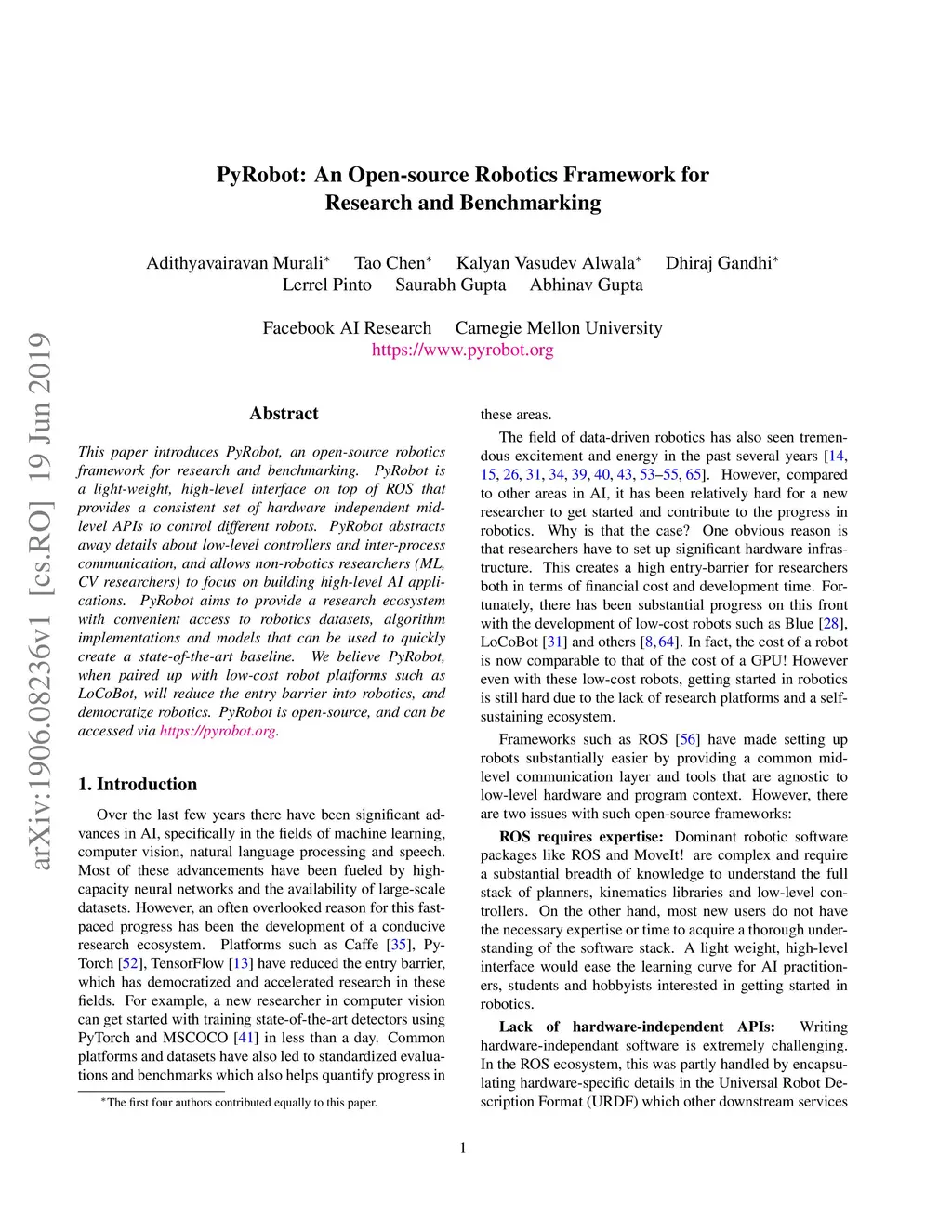 This paper introduces PyRobot, an open-source robotics framework for research and benchmarking. PyRobot is a light-weight, high-level interface on top of ROS that provides a consistent set of hardware independent mid-level APIs to control different robots. PyRobot abstracts away details about low-level controllers and inter-process communication, and allows non-robotics researchers (ML, CV researchers) to focus on building high-level AI applications. PyRobot aims to provide a research ecosystem with convenient access to robotics datasets, algorithm implementations and models that can be used to quickly create a state-of-the-art baseline. We believe PyRobot, when paired up with low-cost robot platforms such as LoCoBot, will reduce the entry barrier into robotics, and democratize robotics. PyRobot is open-source, and can be accessed via https://pyrobot.org.