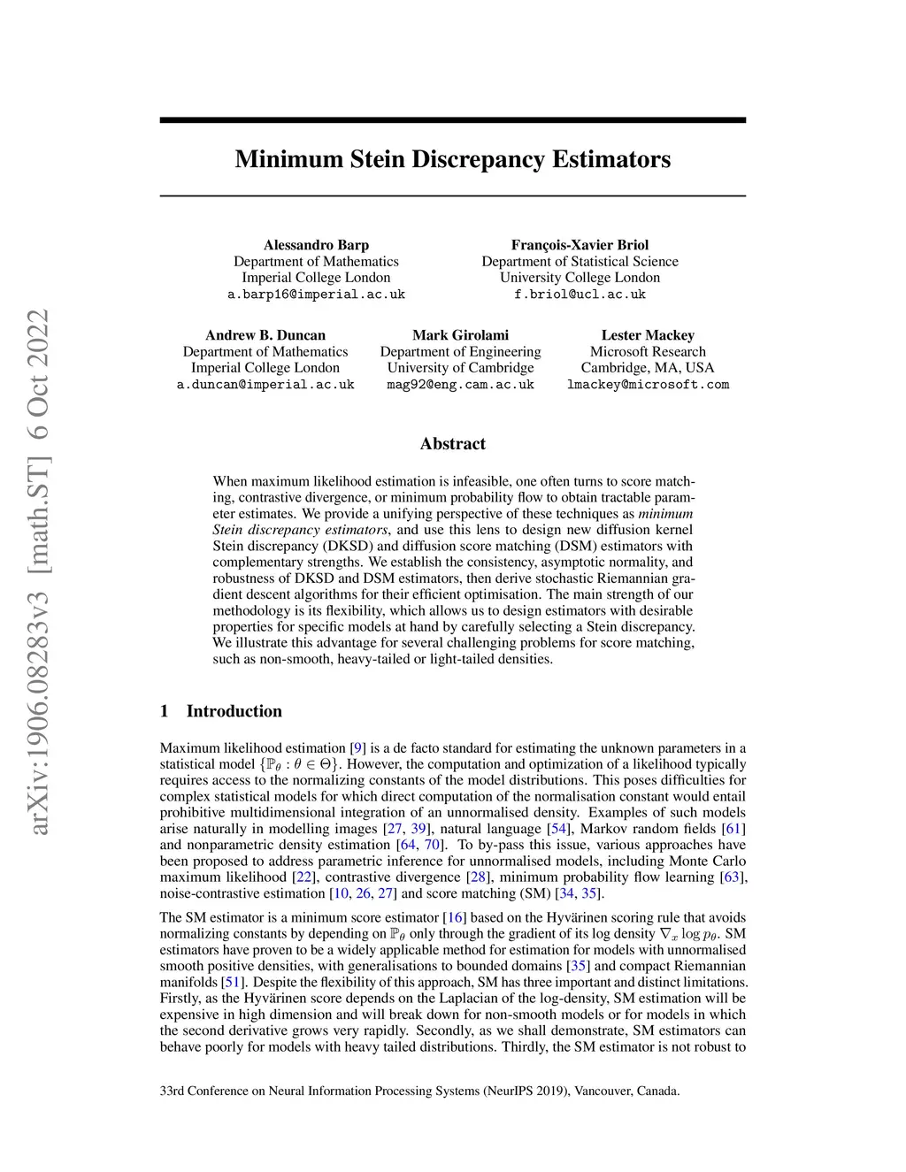 Minimum Stein Discrepancy Estimators