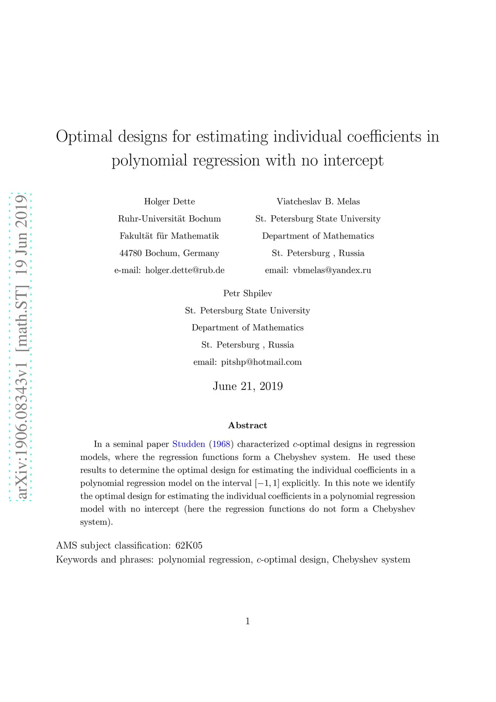 In a seminal paper \cite{studden1968} characterized -optimal designs in regression models, where the regression functions form a Chebyshev system. He used these results to determine the optimal design for estimating the individual coefficients in a polynomial regression model on the interval explicitly. In this note we identify the optimal design for estimating the individual coefficients in a polynomial regression model with no intercept (here the regression functions do not form a Chebyshev system).