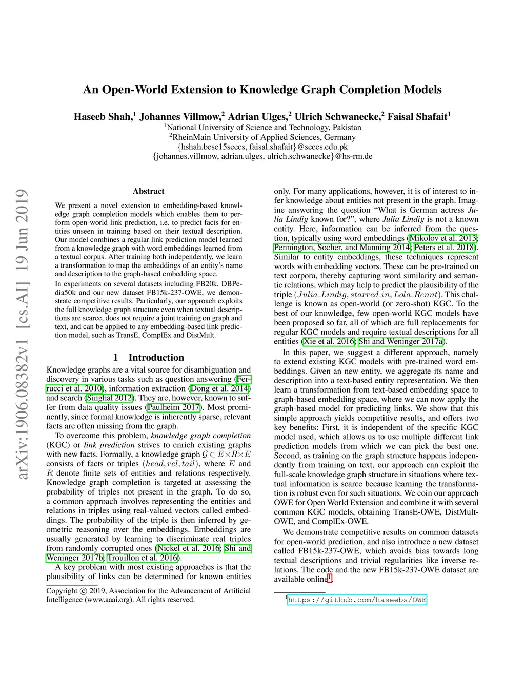 We present a novel extension to embedding-based knowledge graph completion models which enables them to perform open-world link prediction, i.e. to predict facts for entities unseen in training based on their textual description. Our model combines a regular link prediction model learned from a knowledge graph with word embeddings learned from a textual corpus. After training both independently, we learn a transformation to map the embeddings of an entity's name and description to the graph-based embedding space. In experiments on several datasets including FB20k, DBPedia50k and our new dataset FB15k-237-OWE, we demonstrate competitive results. Particularly, our approach exploits the full knowledge graph structure even when textual descriptions are scarce, does not require a joint training on graph and text, and can be applied to any embedding-based link prediction model, such as TransE, ComplEx and DistMult.