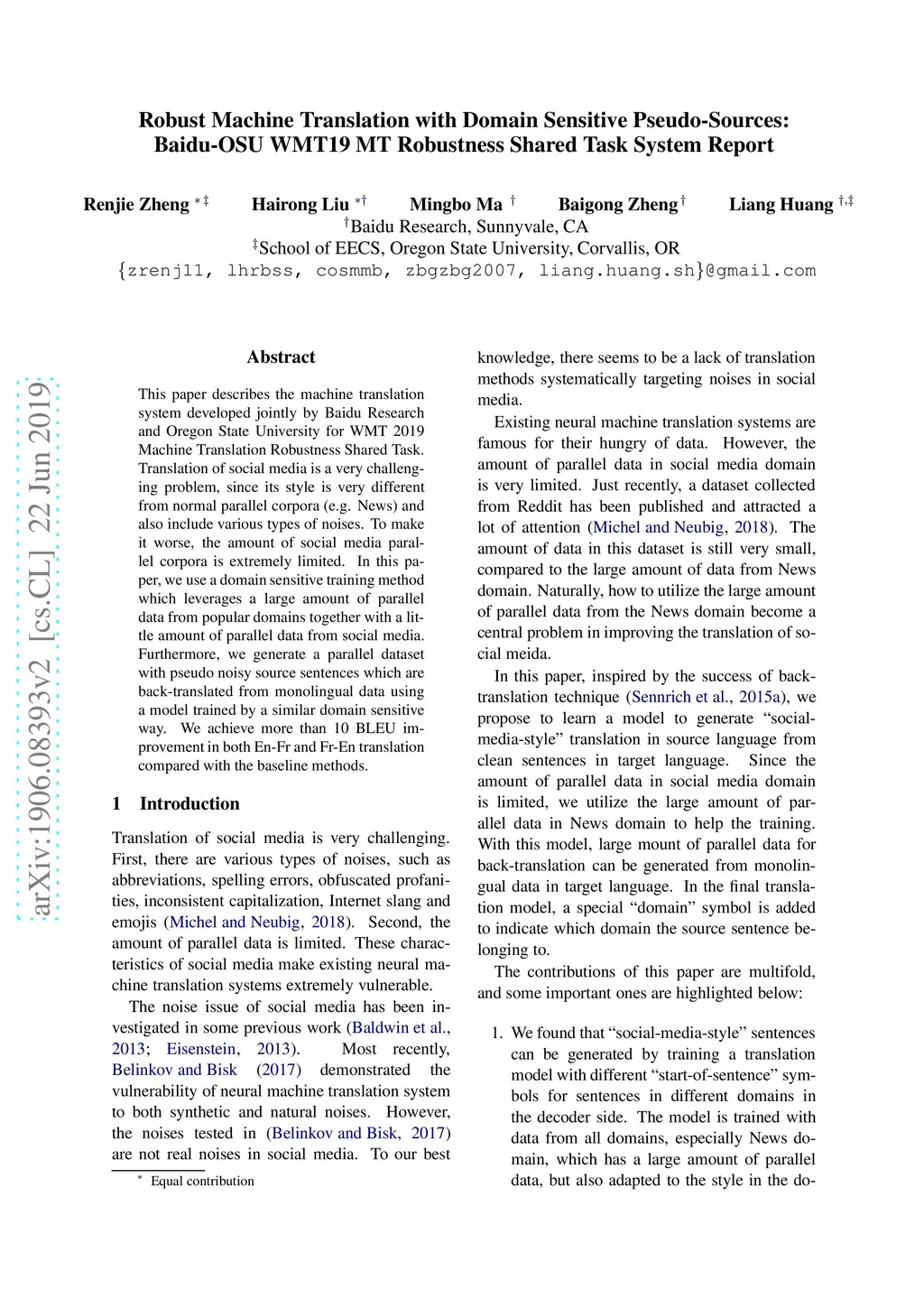 This paper describes the machine translation system developed jointly by Baidu Research and Oregon State University for WMT 2019 Machine Translation Robustness Shared Task. Translation of social media is a very challenging problem, since its style is very different from normal parallel corpora (e.g. News) and also include various types of noises. To make it worse, the amount of social media parallel corpora is extremely limited. In this paper, we use a domain sensitive training method which leverages a large amount of parallel data from popular domains together with a little amount of parallel data from social media. Furthermore, we generate a parallel dataset with pseudo noisy source sentences which are back-translated from monolingual data using a model trained by a similar domain sensitive way. We achieve more than 10 BLEU improvement in both En-Fr and Fr-En translation compared with the baseline methods.