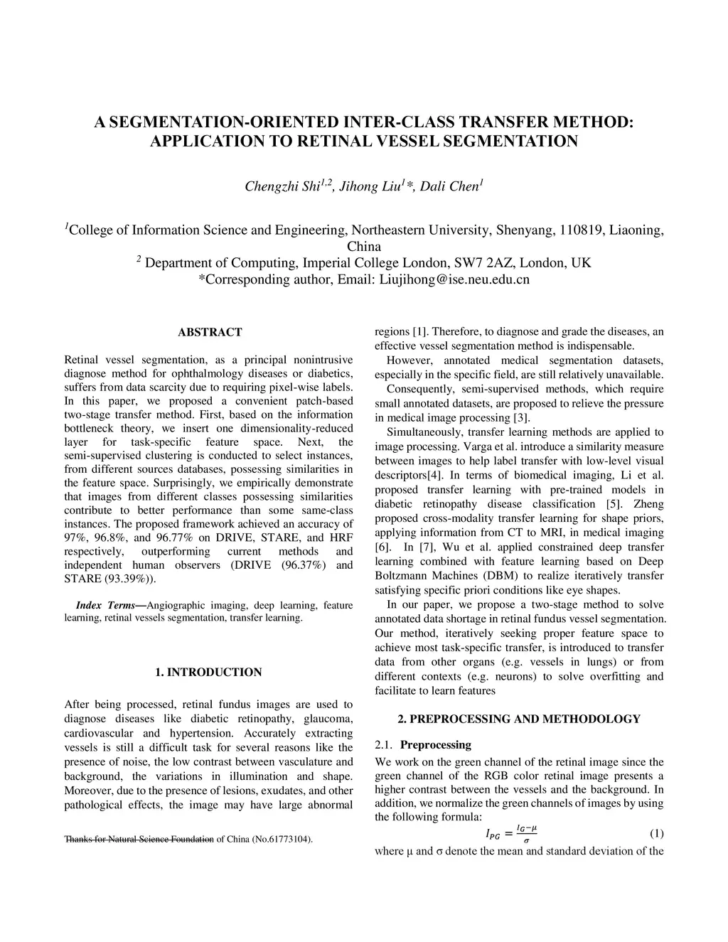 Retinal vessel segmentation, as a principal nonintrusive diagnose method for ophthalmology diseases or diabetics, suffers from data scarcity due to requiring pixel-wise labels. In this paper, we proposed a convenient patch-based two-stage transfer method. First, based on the information bottleneck theory, we insert one dimensionality-reduced layer for task-specific feature space. Next, the semi-supervised clustering is conducted to select instances, from different sources databases, possessing similarities in the feature space. Surprisingly, we empirically demonstrate that images from different classes possessing similarities contribute to better performance than some same-class instances. The proposed framework achieved an accuracy of 97%, 96.8%, and 96.77% on DRIVE, STARE, and HRF respectively, outperforming current methods and independent human observers (DRIVE (96.37%) and STARE (93.39%)).