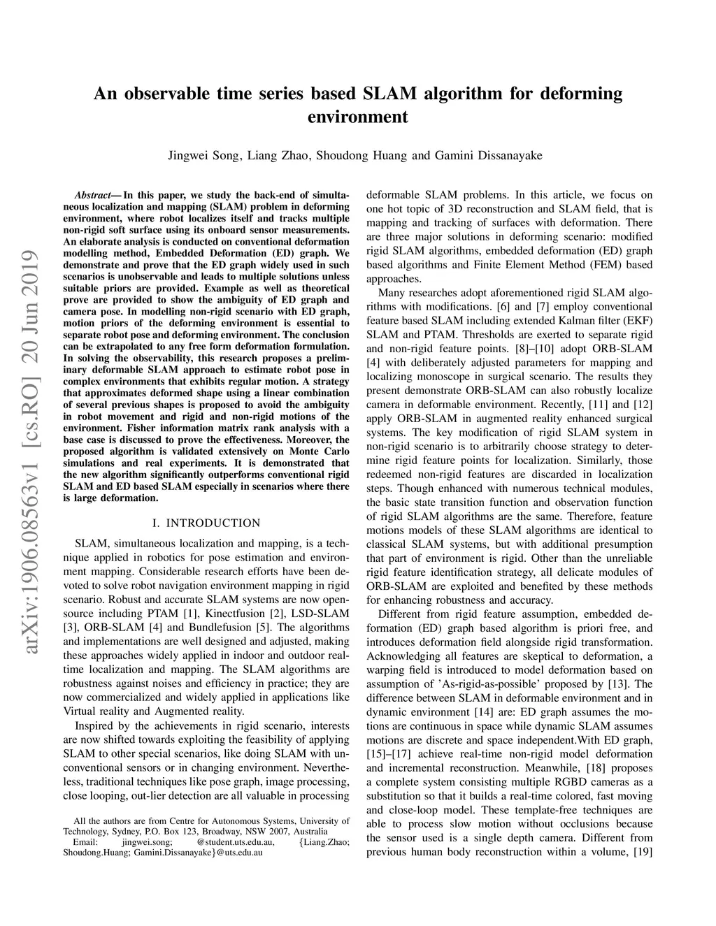 In this paper, we study the back-end of simultaneous localization and mapping (SLAM) problem in deforming environment, where robot localizes itself and tracks multiple non-rigid soft surface using its onboard sensor measurements. An elaborate analysis is conducted on conventional deformation modelling method, Embedded Deformation (ED) graph. We demonstrate and prove that the ED graph widely used in such scenarios is unobservable and leads to multiple solutions unless suitable priors are provided. Example as well as theoretical prove are provided to show the ambiguity of ED graph and camera pose. In modelling non-rigid scenario with ED graph, motion priors of the deforming environment is essential to separate robot pose and deforming environment. The conclusion can be extrapolated to any free form deformation formulation. In solving the observability, this research proposes a preliminary deformable SLAM approach to estimate robot pose in complex environments that exhibits regular motion. A strategy that approximates deformed shape using a linear combination of several previous shapes is proposed to avoid the ambiguity in robot movement and rigid and non-rigid motions of the environment. Fisher information matrix rank analysis with a base case is discussed to prove the effectiveness. Moreover, the proposed algorithm is validated extensively on Monte Carlo simulations and real experiments. It is demonstrated that the new algorithm significantly outperforms conventional rigid SLAM and ED based SLAM especially in scenarios where there is large deformation.