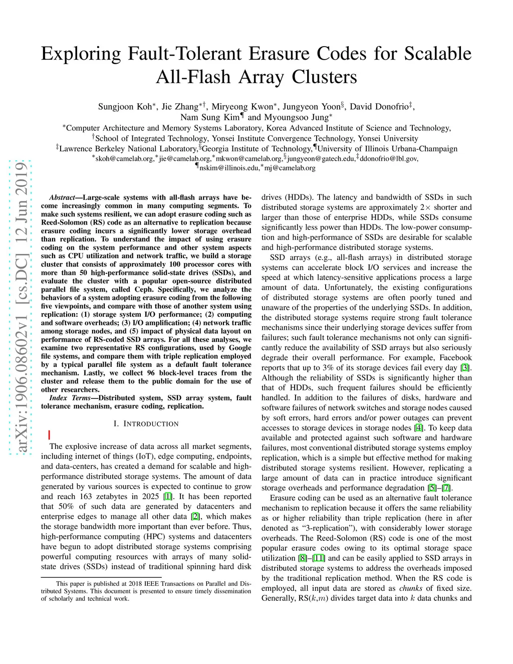 Large-scale systems with all-flash arrays have become increasingly common in many computing segments. To make such systems resilient, we can adopt erasure coding such as Reed-Solomon (RS) code as an alternative to replication because erasure coding incurs a significantly lower storage overhead than replication. To understand the impact of using erasure coding on the system performance and other system aspects such as CPU utilization and network traffic, we build a storage cluster that consists of approximately 100 processor cores with more than 50 high-performance solid-state drives (SSDs), and evaluate the cluster with a popular open-source distributed parallel file system, called Ceph. Specifically, we analyze the behaviors of a system adopting erasure coding from the following five viewpoints, and compare with those of another system using replication: (1) storage system I/O performance; (2) computing and software overheads; (3) I/O amplification; (4) network traffic among storage nodes, and (5) impact of physical data layout on performance of RS-coded SSD arrays. For all these analyses, we examine two representative RS configurations, used by Google file systems, and compare them with triple replication employed by a typical parallel file system as a default fault tolerance mechanism. Lastly, we collect 96 block-level traces from the cluster and release them to the public domain for the use of other researchers.