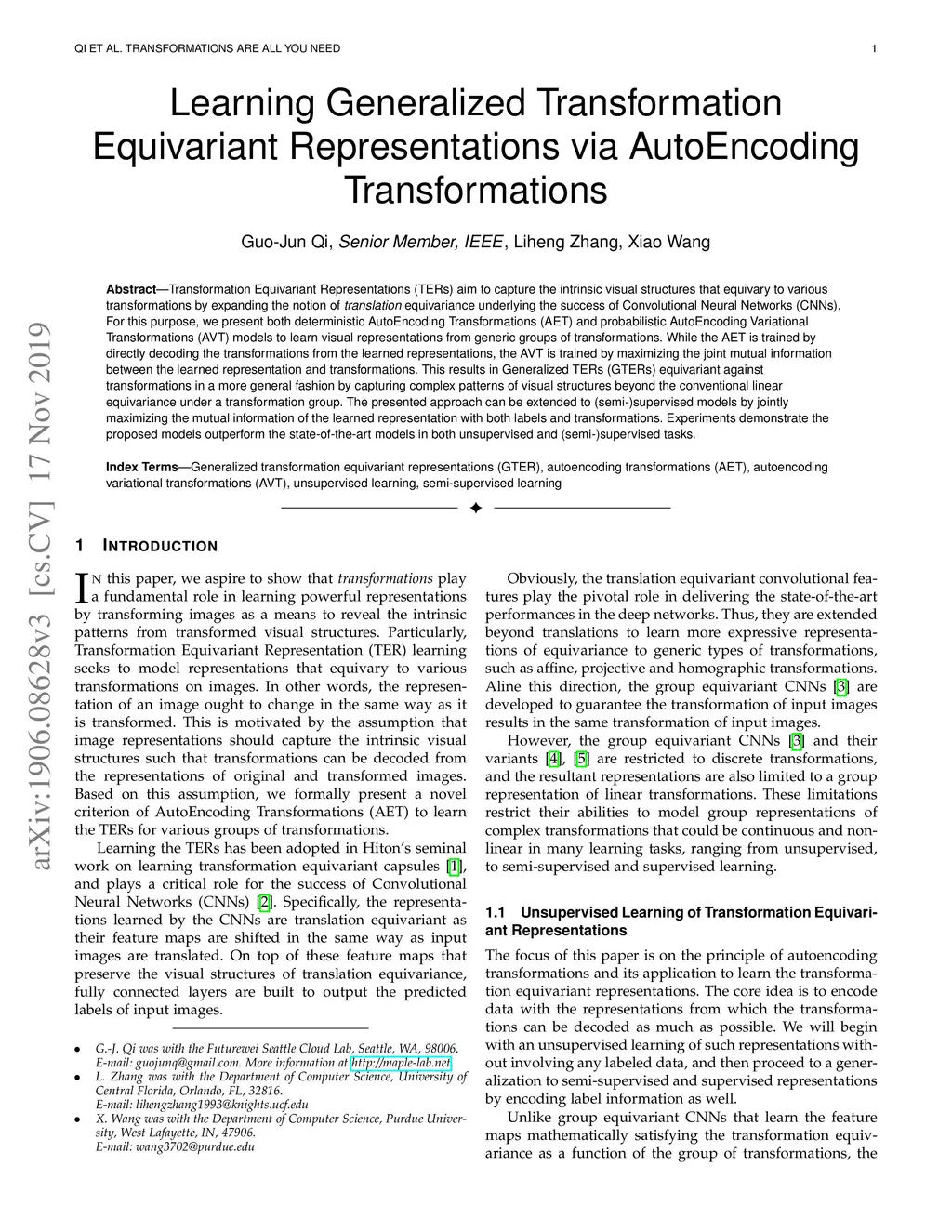 Transformation Equivariant Representations (TERs) aim to capture the intrinsic visual structures that equivary to various transformations by expanding the notion of {\em translation} equivariance underlying the success of Convolutional Neural Networks (CNNs). For this purpose, we present both deterministic AutoEncoding Transformations (AET) and probabilistic AutoEncoding Variational Transformations (AVT) models to learn visual representations from generic groups of transformations. While the AET is trained by directly decoding the transformations from the learned representations, the AVT is trained by maximizing the joint mutual information between the learned representation and transformations. This results in Generalized TERs (GTERs) equivariant against transformations in a more general fashion by capturing complex patterns of visual structures beyond the conventional linear equivariance under a transformation group. The presented approach can be extended to (semi-)supervised models by jointly maximizing the mutual information of the learned representation with both labels and transformations. Experiments demonstrate the proposed models outperform the state-of-the-art models in both unsupervised and (semi-)supervised tasks.