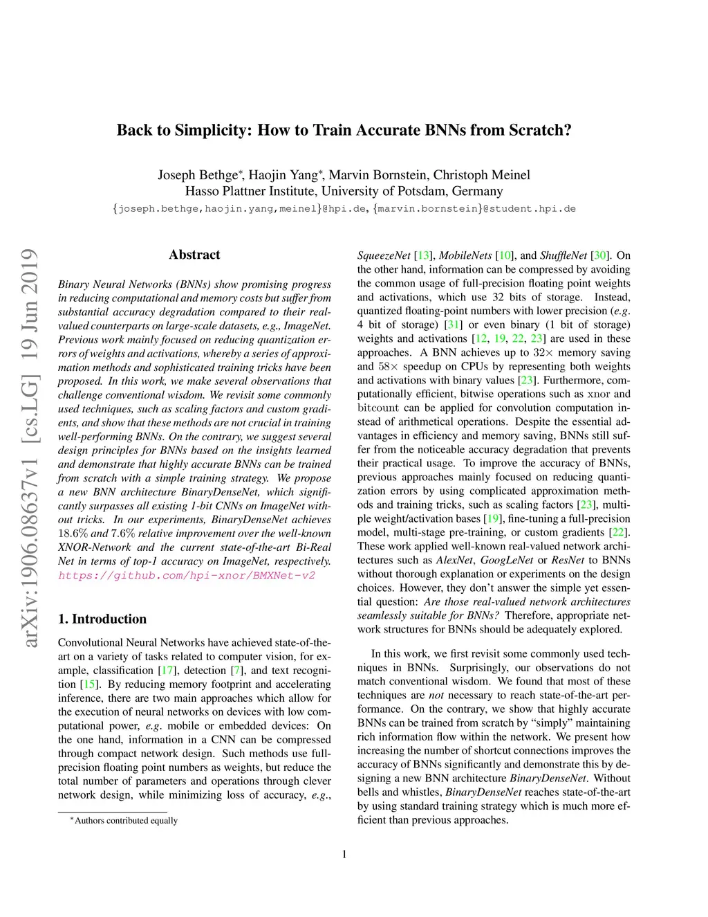 Binary Neural Networks (BNNs) show promising progress in reducing computational and memory costs but suffer from substantial accuracy degradation compared to their real-valued counterparts on large-scale datasets, e.g., ImageNet. Previous work mainly focused on reducing quantization errors of weights and activations, whereby a series of approximation methods and sophisticated training tricks have been proposed. In this work, we make several observations that challenge conventional wisdom. We revisit some commonly used techniques, such as scaling factors and custom gradients, and show that these methods are not crucial in training well-performing BNNs. On the contrary, we suggest several design principles for BNNs based on the insights learned and demonstrate that highly accurate BNNs can be trained from scratch with a simple training strategy. We propose a new BNN architecture BinaryDenseNet, which significantly surpasses all existing 1-bit CNNs on ImageNet without tricks. In our experiments, BinaryDenseNet achieves 18.6% and 7.6% relative improvement over the well-known XNOR-Network and the current state-of-the-art Bi-Real Net in terms of top-1 accuracy on ImageNet, respectively.