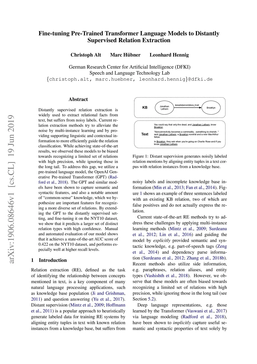Distantly supervised relation extraction is widely used to extract relational facts from text, but suffers from noisy labels. Current relation extraction methods try to alleviate the noise by multi-instance learning and by providing supporting linguistic and contextual information to more efficiently guide the relation classification. While achieving state-of-the-art results, we observed these models to be biased towards recognizing a limited set of relations with high precision, while ignoring those in the long tail. To address this gap, we utilize a pre-trained language model, the OpenAI Generative Pre-trained Transformer (GPT) [Radford et al., 2018]. The GPT and similar models have been shown to capture semantic and syntactic features, and also a notable amount of "common-sense" knowledge, which we hypothesize are important features for recognizing a more diverse set of relations. By extending the GPT to the distantly supervised setting, and fine-tuning it on the NYT10 dataset, we show that it predicts a larger set of distinct relation types with high confidence. Manual and automated evaluation of our model shows that it achieves a state-of-the-art AUC score of 0.422 on the NYT10 dataset, and performs especially well at higher recall levels.