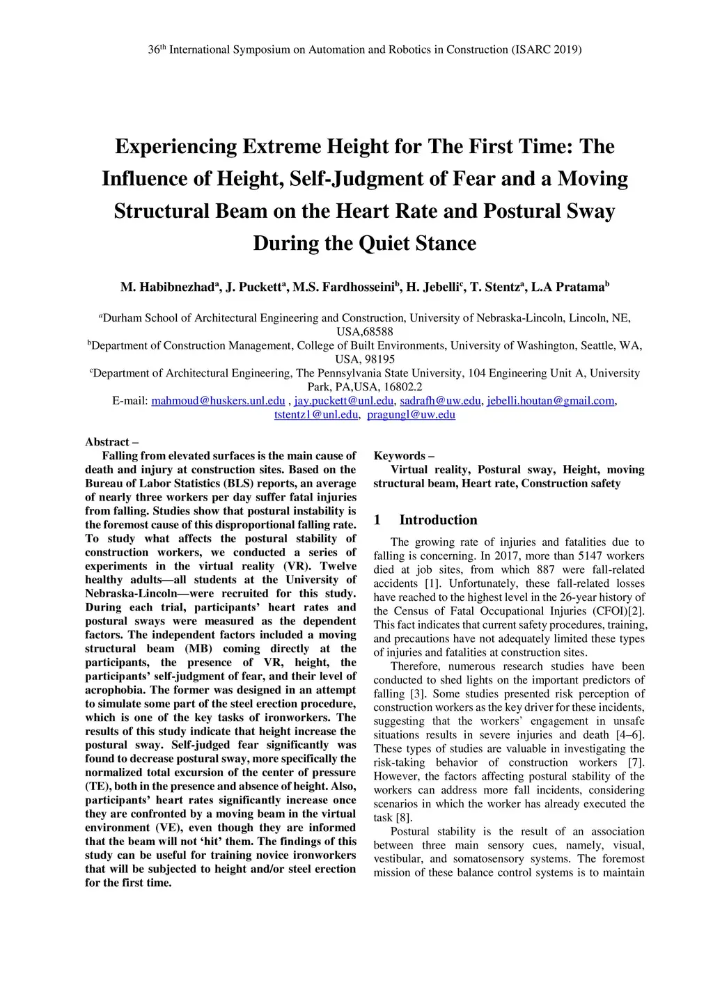 Falling from elevated surfaces is the main cause of death and injury at construction sites. Based on the Bureau of Labor Statistics (BLS) reports, an average of nearly three workers per day suffer fatal injuries from falling. Studies show that postural instability is the foremost cause of this disproportional falling rate. To study what affects the postural stability of construction workers, we conducted a series of experiments in the virtual reality (VR). Twelve healthy adults, all students at the University of Nebraska were recruited for this study. During each trial, participants heart rates and postural sways were measured as the dependent factors. The independent factors included a moving structural beam (MB) coming directly at the participants, the presence of VR, height, the participants self-judgment of fear, and their level of acrophobia. The former was designed in an attempt to simulate some part of the steel erection procedure, which is one of the key tasks of ironworkers. The results of this study indicate that height increase the postural sway. Self-judged fear significantly was found to decrease postural sway, more specifically the normalized total excursion of the center of pressure (TE), both in the presence and absence of height. Also, participants heart rates significantly increase once they are confronted by a moving beam in the virtual environment (VE), even though they are informed that the beam will not hit them. The findings of this study can be useful for training novice ironworkers that will be subjected to height and steel erection for the first time.