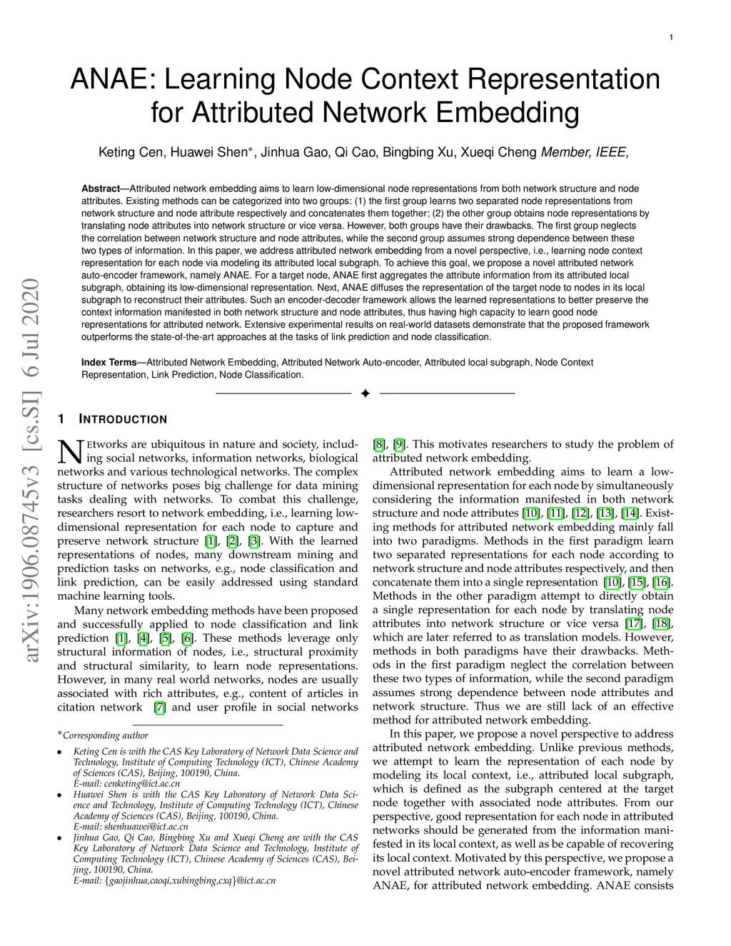 Attributed network embedding aims to learn low-dimensional node representations from both network structure and node attributes. Existing methods can be categorized into two groups: (1) the first group learns two separated node representations from network structure and node attribute respectively and concatenates them together; (2) the other group obtains node representations by translating node attributes into network structure or vice versa. However, both groups have their drawbacks. The first group neglects the correlation between network structure and node attributes, while the second group assumes strong dependence between these two types of information. In this paper, we address attributed network embedding from a novel perspective, i.e., learning node context representation for each node via modeling its attributed local subgraph. To achieve this goal, we propose a novel attributed network auto-encoder framework, namely ANAE. For a target node, ANAE first aggregates the attribute information from its attributed local subgraph, obtaining its low-dimensional representation. Next, ANAE diffuses the representation of the target node to nodes in its local subgraph to reconstruct their attributes. Such an encoder-decoder framework allows the learned representations to better preserve the context information manifested in both network structure and node attributes, thus having high capacity to learn good node representations for attributed network. Extensive experimental results on real-world datasets demonstrate that the proposed framework outperforms the state-of-the-art approaches at the tasks of link prediction and node classification.