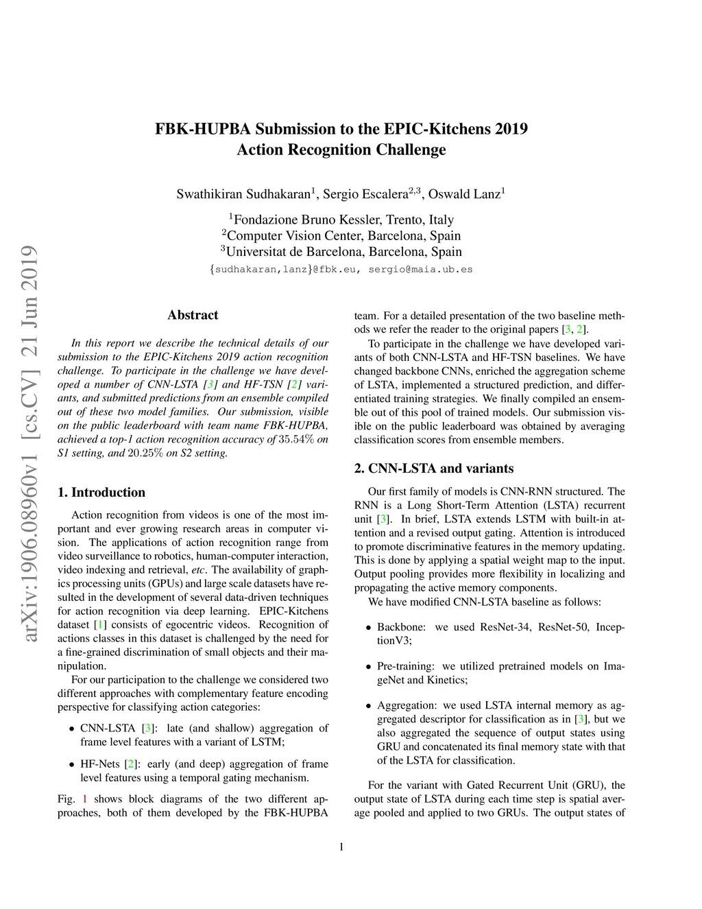 In this report we describe the technical details of our submission to the EPIC-Kitchens 2019 action recognition challenge. To participate in the challenge we have developed a number of CNN-LSTA [3] and HF-TSN [2] variants, and submitted predictions from an ensemble compiled out of these two model families. Our submission, visible on the public leaderboard with team name FBK-HUPBA, achieved a top-1 action recognition accuracy of 35.54% on S1 setting, and 20.25% on S2 setting.