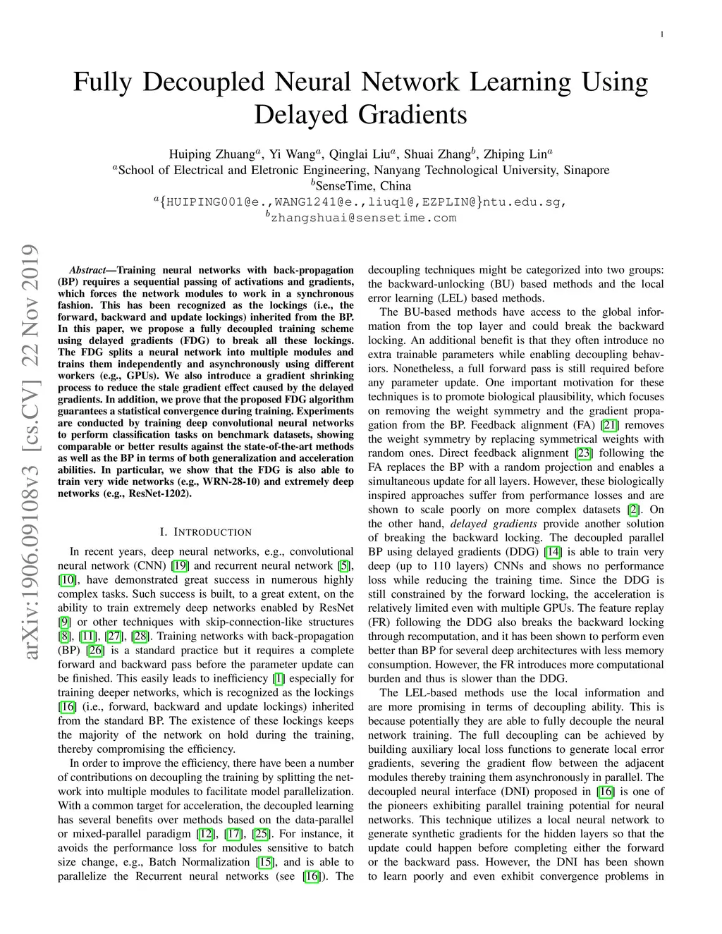 Training neural networks with back-propagation (BP) requires a sequential passing of activations and gradients, which forces the network modules to work in a synchronous fashion. This has been recognized as the lockings (i.e., the forward, backward and update lockings) inherited from the BP. In this paper, we propose a fully decoupled training scheme using delayed gradients (FDG) to break all these lockings. The FDG splits a neural network into multiple modules and trains them independently and asynchronously using different workers (e.g., GPUs). We also introduce a gradient shrinking process to reduce the stale gradient effect caused by the delayed gradients. In addition, we prove that the proposed FDG algorithm guarantees a statistical convergence during training. Experiments are conducted by training deep convolutional neural networks to perform classification tasks on benchmark datasets, showing comparable or better results against the state-of-the-art methods as well as the BP in terms of both generalization and acceleration abilities. In particular, we show that the FDG is also able to train very wide networks (e.g., WRN-28-10) and extremely deep networks (e.g., ResNet-1202). Code is available at https://github.com/ZHUANGHP/FDG.