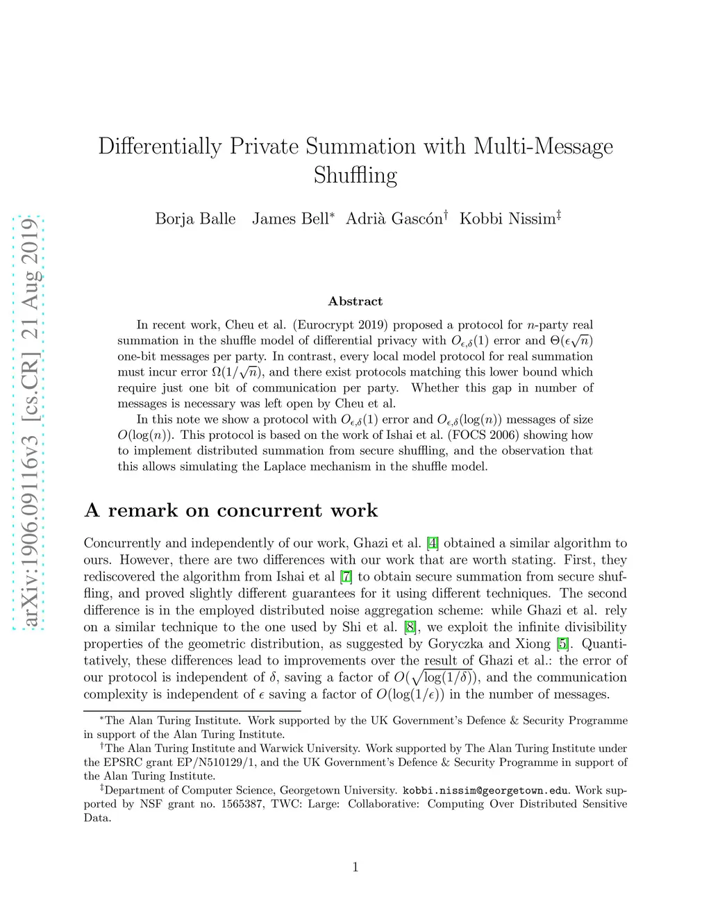 In recent work, Cheu et al. (Eurocrypt 2019) proposed a protocol for -party real summation in the shuffle model of differential privacy with error and one-bit messages per party. In contrast, every local model protocol for real summation must incur error , and there exist protocols matching this lower bound which require just one bit of communication per party. Whether this gap in number of messages is necessary was left open by Cheu et al. In this note we show a protocol with error and messages of size per party. This protocol is based on the work of Ishai et al.\ (FOCS 2006) showing how to implement distributed summation from secure shuffling, and the observation that this allows simulating the Laplace mechanism in the shuffle model.