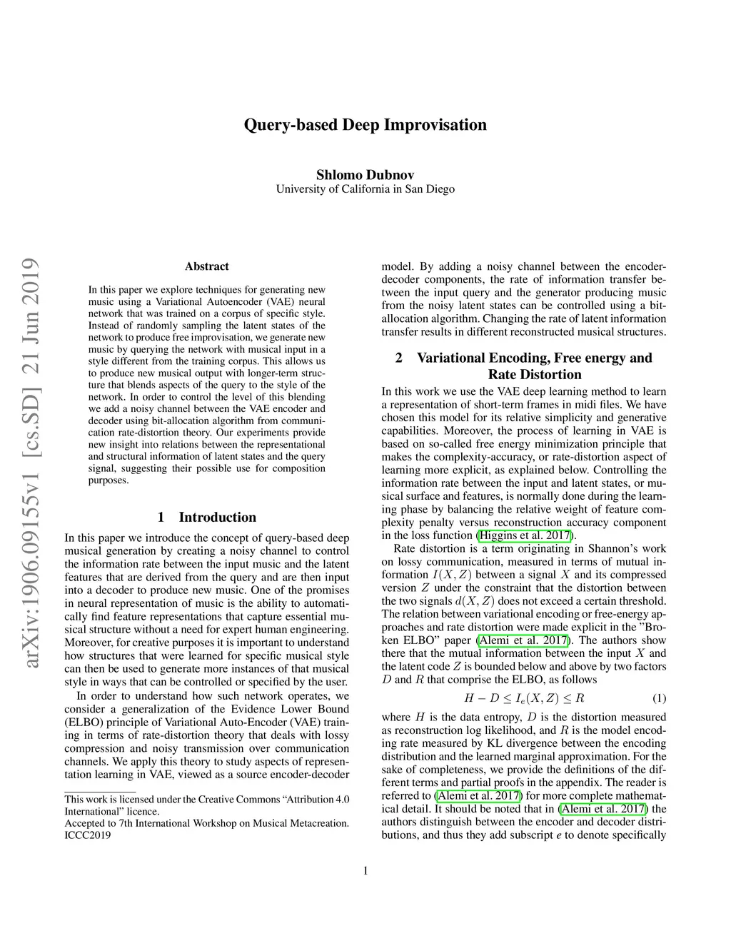In this paper we explore techniques for generating new music using a Variational Autoencoder (VAE) neural network that was trained on a corpus of specific style. Instead of randomly sampling the latent states of the network to produce free improvisation, we generate new music by querying the network with musical input in a style different from the training corpus. This allows us to produce new musical output with longer-term structure that blends aspects of the query to the style of the network. In order to control the level of this blending we add a noisy channel between the VAE encoder and decoder using bit-allocation algorithm from communication rate-distortion theory. Our experiments provide new insight into relations between the representational and structural information of latent states and the query signal, suggesting their possible use for composition purposes.