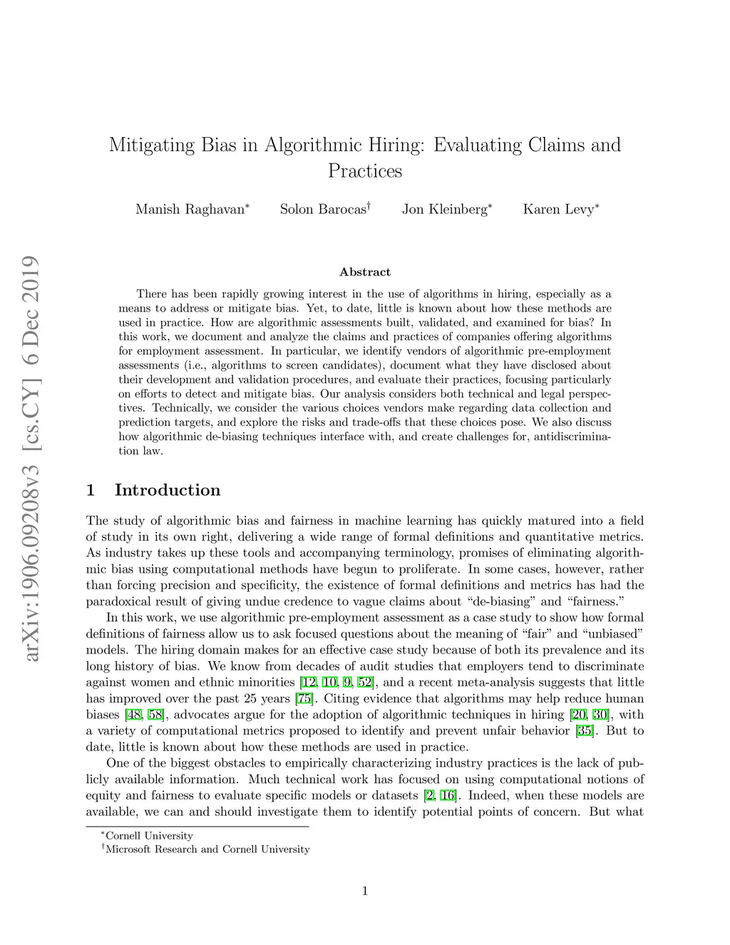 There has been rapidly growing interest in the use of algorithms in hiring, especially as a means to address or mitigate bias. Yet, to date, little is known about how these methods are used in practice. How are algorithmic assessments built, validated, and examined for bias? In this work, we document and analyze the claims and practices of companies offering algorithms for employment assessment. In particular, we identify vendors of algorithmic pre-employment assessments (i.e., algorithms to screen candidates), document what they have disclosed about their development and validation procedures, and evaluate their practices, focusing particularly on efforts to detect and mitigate bias. Our analysis considers both technical and legal perspectives. Technically, we consider the various choices vendors make regarding data collection and prediction targets, and explore the risks and trade-offs that these choices pose. We also discuss how algorithmic de-biasing techniques interface with, and create challenges for, antidiscrimination law.