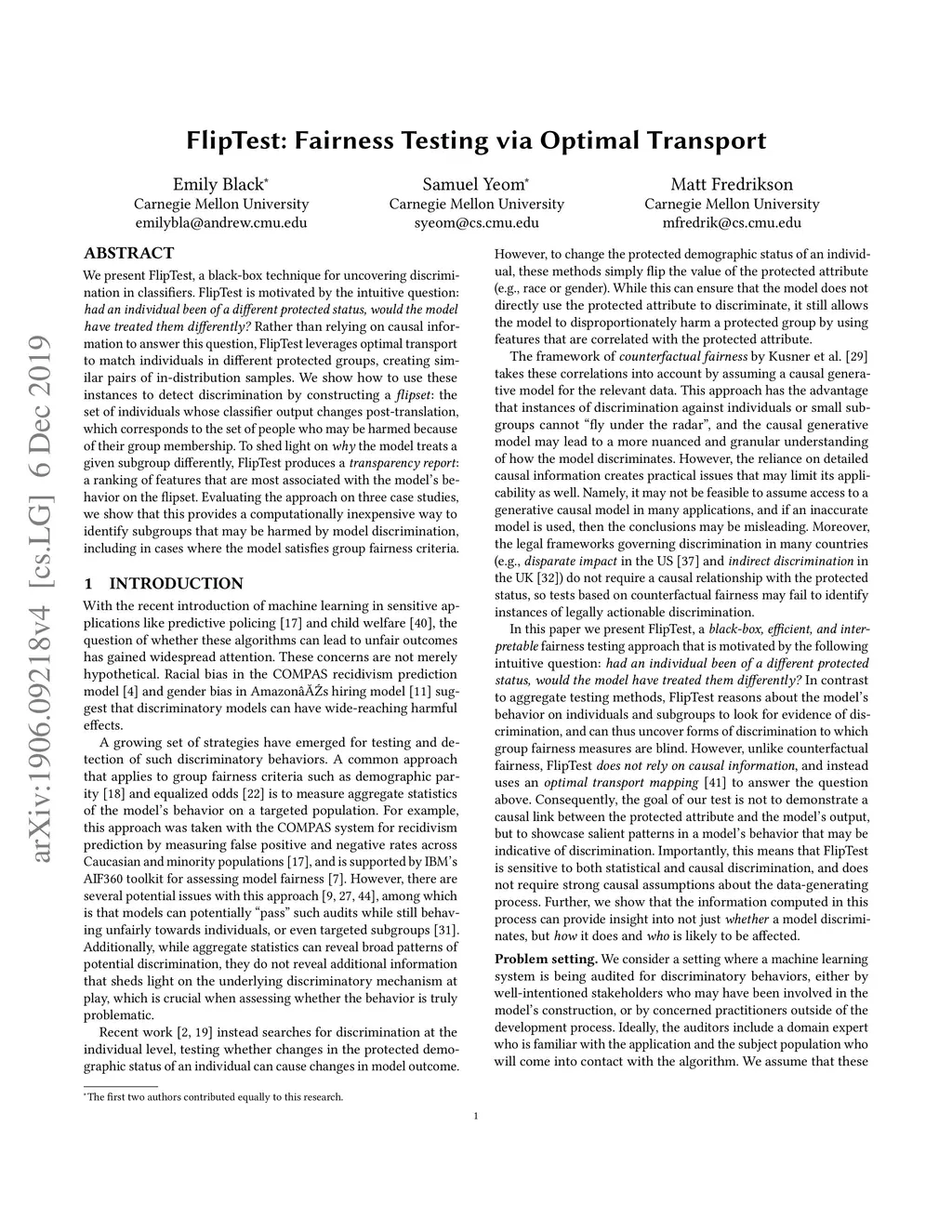 We present FlipTest, a black-box technique for uncovering discrimination in classifiers. FlipTest is motivated by the intuitive question: had an individual been of a different protected status, would the model have treated them differently? Rather than relying on causal information to answer this question, FlipTest leverages optimal transport to match individuals in different protected groups, creating similar pairs of in-distribution samples. We show how to use these instances to detect discrimination by constructing a "flipset": the set of individuals whose classifier output changes post-translation, which corresponds to the set of people who may be harmed because of their group membership. To shed light on why the model treats a given subgroup differently, FlipTest produces a "transparency report": a ranking of features that are most associated with the model's behavior on the flipset. Evaluating the approach on three case studies, we show that this provides a computationally inexpensive way to identify subgroups that may be harmed by model discrimination, including in cases where the model satisfies group fairness criteria.