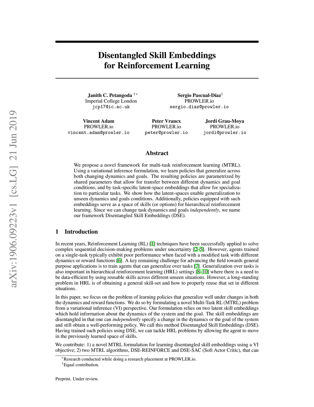 Disentangled Skill Embeddings for Reinforcement Learning