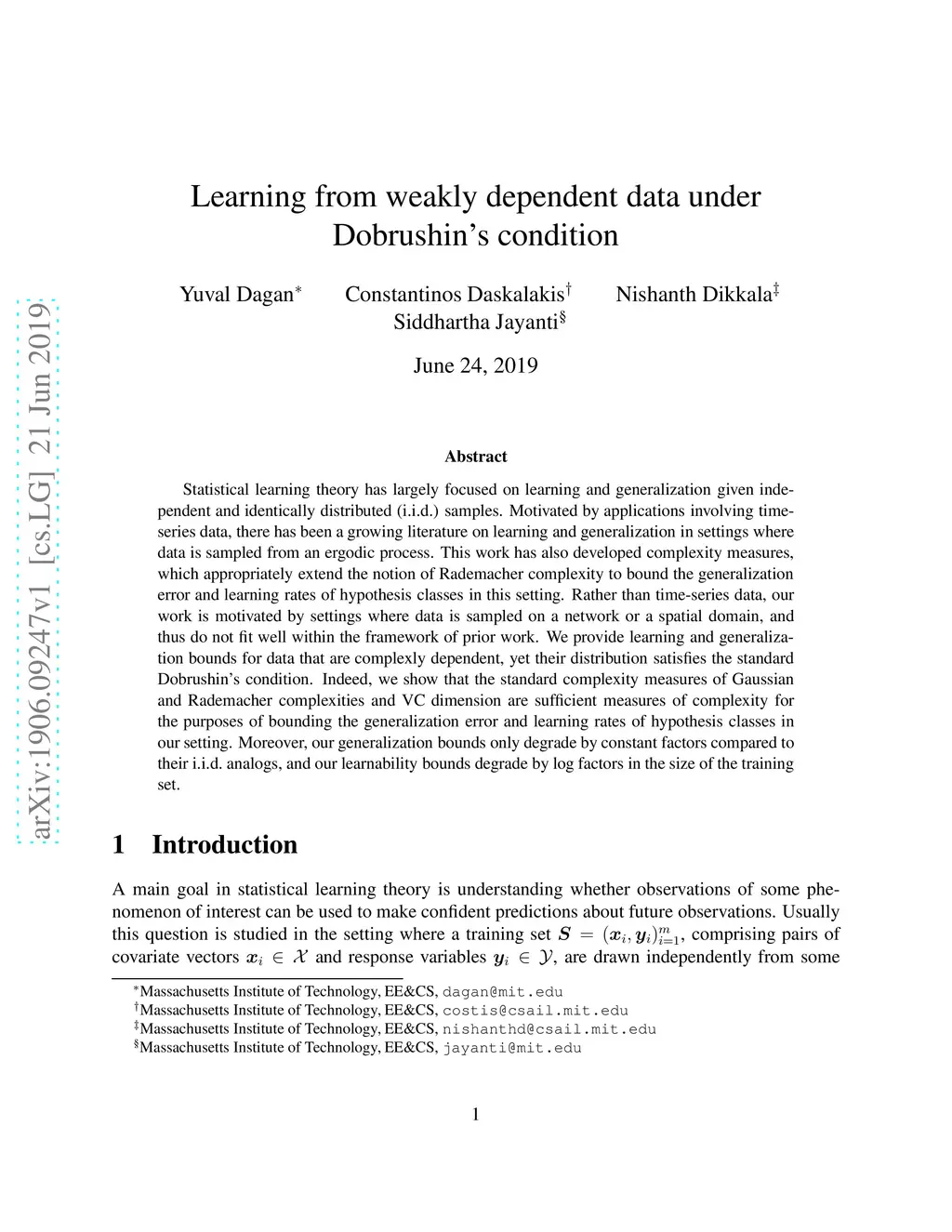 Statistical learning theory has largely focused on learning and generalization given independent and identically distributed (i.i.d.) samples. Motivated by applications involving time-series data, there has been a growing literature on learning and generalization in settings where data is sampled from an ergodic process. This work has also developed complexity measures, which appropriately extend the notion of Rademacher complexity to bound the generalization error and learning rates of hypothesis classes in this setting. Rather than time-series data, our work is motivated by settings where data is sampled on a network or a spatial domain, and thus do not fit well within the framework of prior work. We provide learning and generalization bounds for data that are complexly dependent, yet their distribution satisfies the standard Dobrushin's condition. Indeed, we show that the standard complexity measures of Gaussian and Rademacher complexities and VC dimension are sufficient measures of complexity for the purposes of bounding the generalization error and learning rates of hypothesis classes in our setting. Moreover, our generalization bounds only degrade by constant factors compared to their i.i.d. analogs, and our learnability bounds degrade by log factors in the size of the training set.